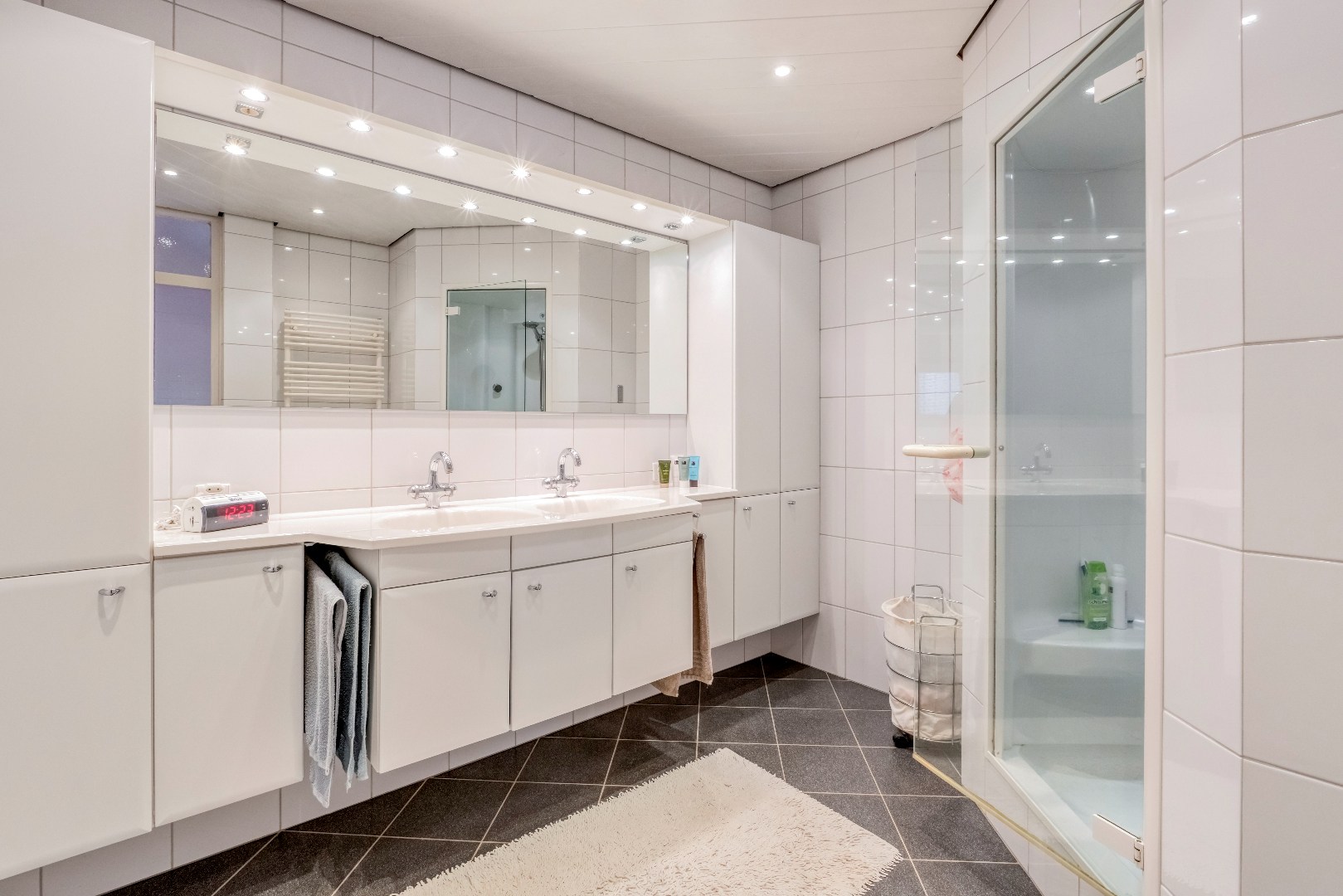 - De royale masterbedroom (maar liefst ca, 30,5m2!) beschikt over een eveneens ruime badkamer (ca. 8m2). Deze is uitgevoerd met een douchecabine met zitgedeelte en massagefunctie, een dubbele wastafel met meubel en een designradiator.