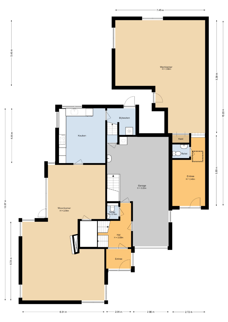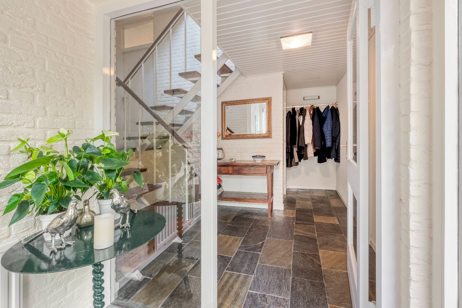 - Bij binnenkomst via de entree met vestibule word je direct verwelkomd door een gevoel van ruimte. De hal met trappenhuis vormt het centrale hart van de woning en biedt toegang tot de diverse verdiepingen.