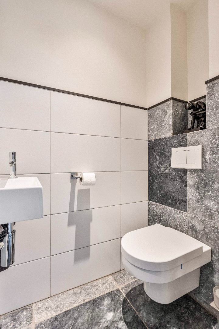 Ruime hal met toegang tot het toilet, de kelder, de trap naar de eerste verdieping en de woonkamer. De royale woonkamer van ca. 63,2 m² is voorzien van een open leefkeuken, twee lichtkoepels en een antracietkleurige tegelvloer van Belgisch hardsteen met vloerverwarming. Grote raampartijen en een schuifpui naar de tuin zorgen voor veel natuurlijk licht en een fijne verbinding met buiten. De luxe keuken is uitgerust met een 5-pits gasfornuis met dubbele oven, stoomoven, combimagnetron, vaatwasser, afzuigkap, koelkast en vriezer. Een sfeervolle houtkachel van het merk Stuv completeert het geheel en zorgt voor extra warmte en gezelligheid.