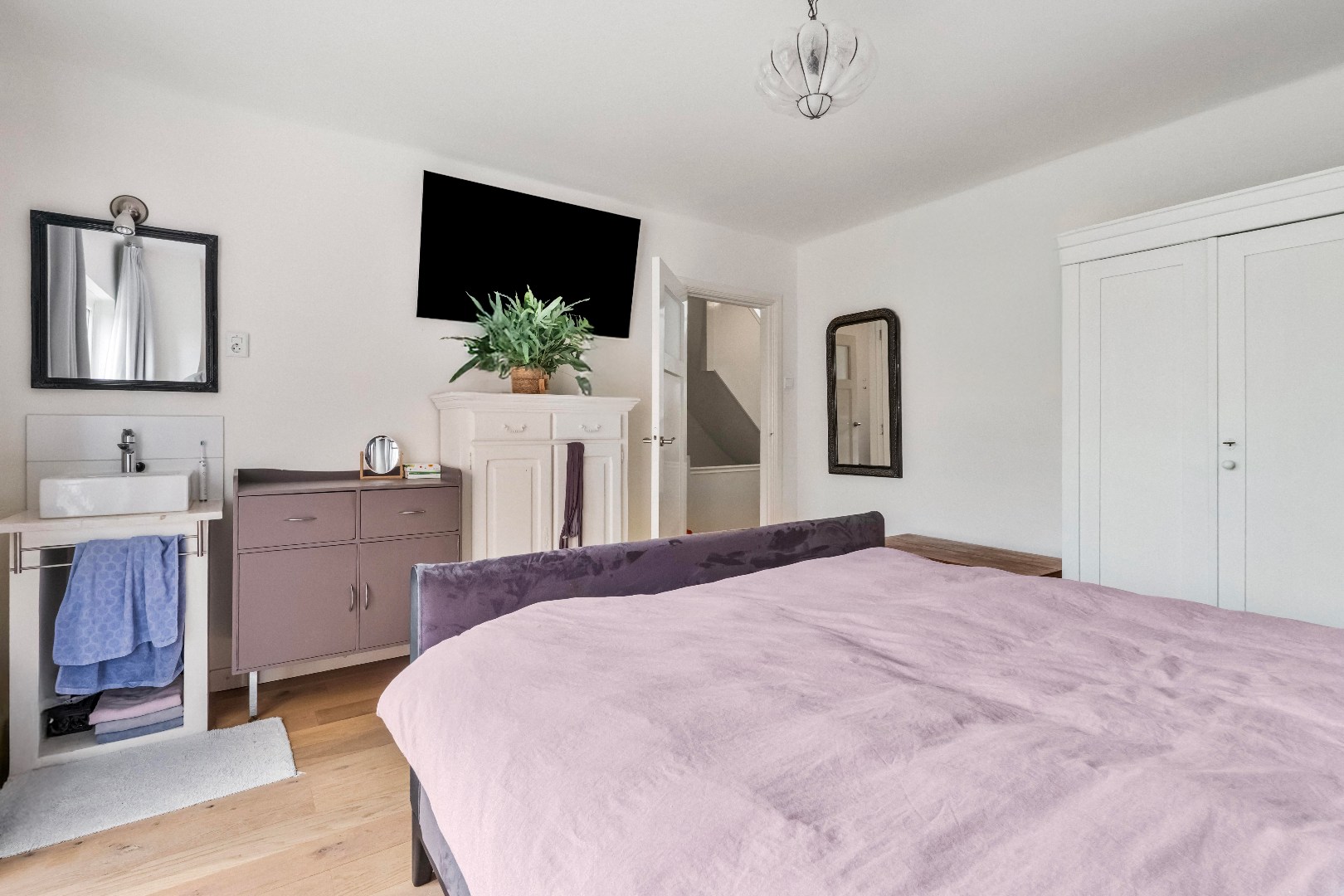 Overloop met toegang tot drie slaapkamers en de badkamer. De trap naar de eerste verdieping is voorzien van een stijlvolle wollen traploper. De gehele verdieping is afgewerkt met een houten parketvloer. De eerste slaapkamer (ca. 18,3 m²) bevindt zich aan de voorzijde van de woning en heeft kunststof kozijnen en een openslaande deur met een Frans balkon, waardoor je volop kunt genieten van frisse lucht en extra lichtinval. De tweede slaapkamer (ca. 17,4 m²) ligt aan de achterzijde, beschikt over een wastafel en biedt toegang tot het ruime balkon van ca. 18,1 m². Ook de derde slaapkamer (ca. 5,9 m²) ligt aan de achterzijde en is compact, voorzien van een wastafel. De moderne badkamer is uitgerust met een ligbad, inloopdouche, zwevend toilet en een dubbele wastafelmeubel.