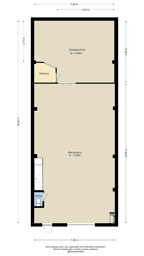 De bedrijfsruimte bestaat uit een ruime werkplaats aan de voorzijde met een vrije hoogte van circa 3,55 meter. Aansluitend bevindt zich een opslagruimte met een vrije hoogte van circa 3,54 meter. Tussen de werkplaats en opslagruimte is een interne scheidingswand met doorgang aanwezig. Daarnaast is een separate kantoorruimte gerealiseerd, geschikt voor administratieve werkzaamheden.