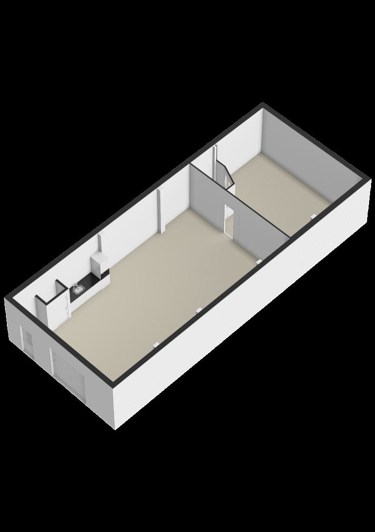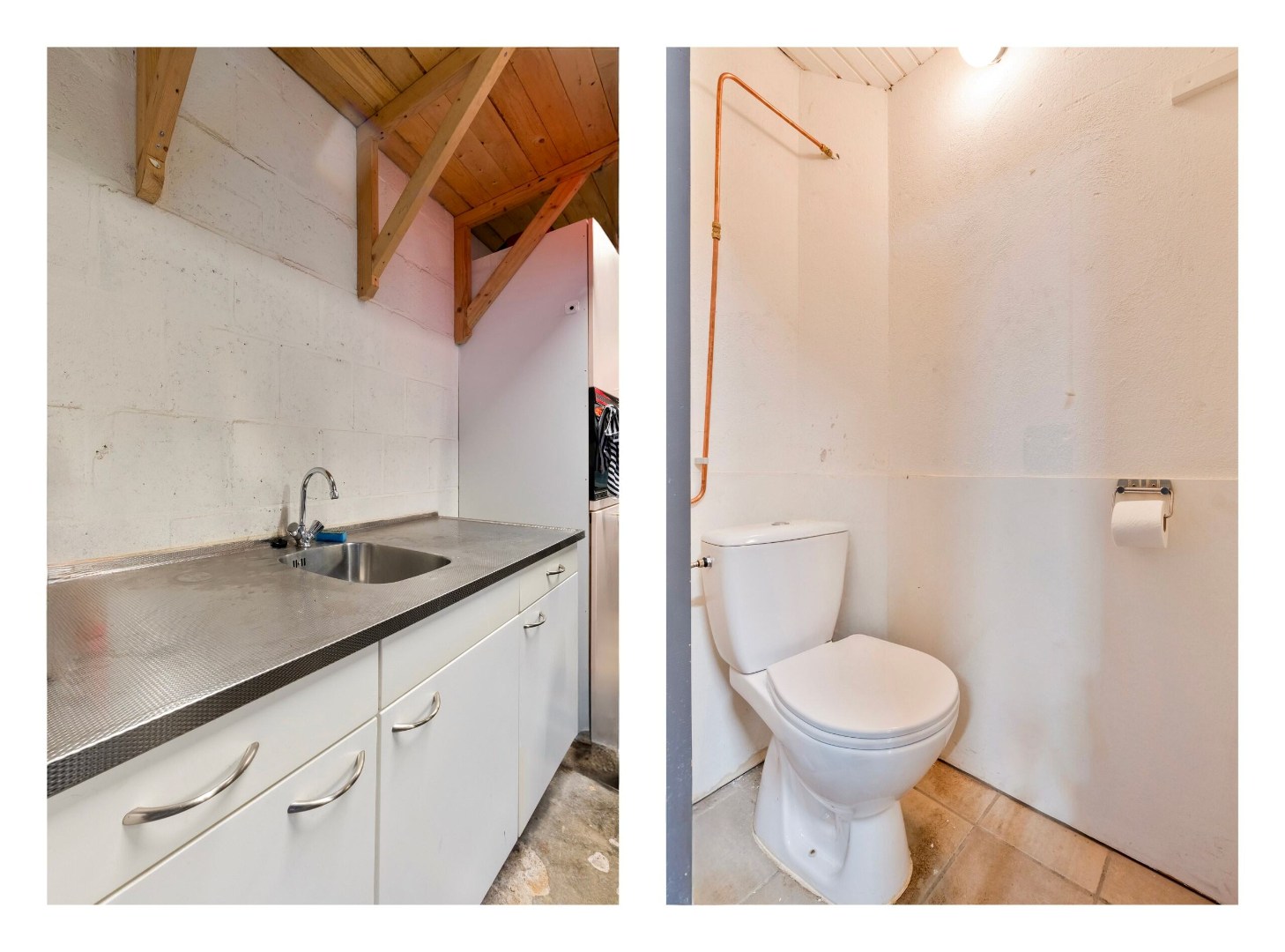 Verder is de ruimte voorzien van een pantry met werkblad en spoelbak, alsmede een separate toiletruimte. De vloer is uitgevoerd in beton en de ruimte is voorzien van functionele verlichting. De constructie bestaat uit betonnen wanden in combinatie met houten dakspanten, hetgeen bijdraagt aan de industriële uitstraling.