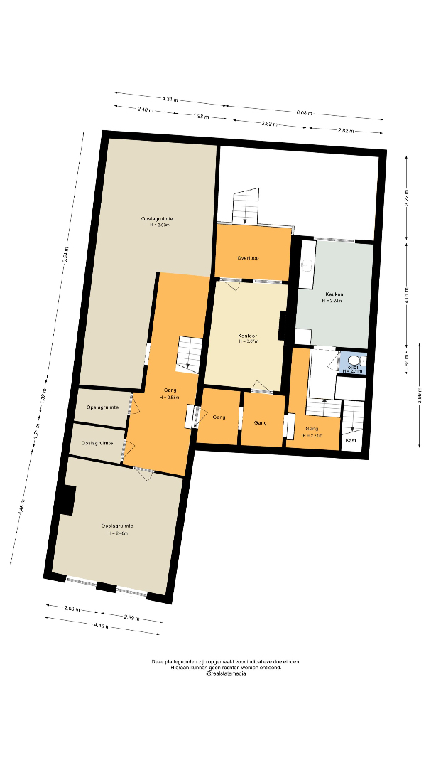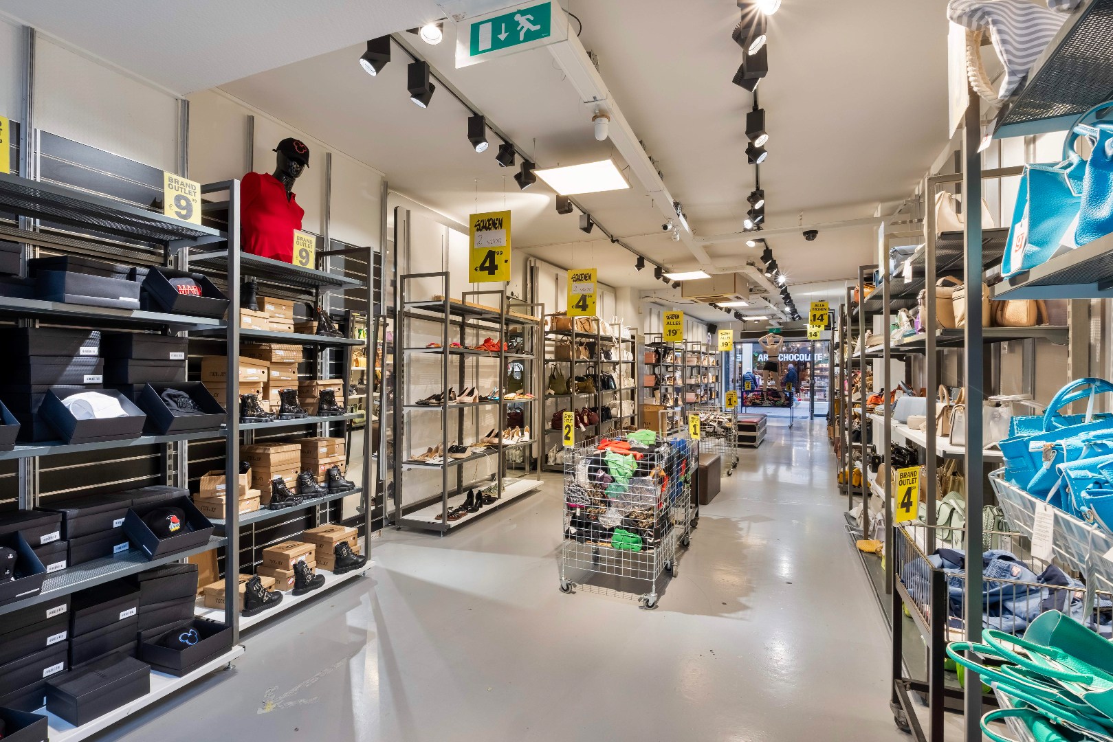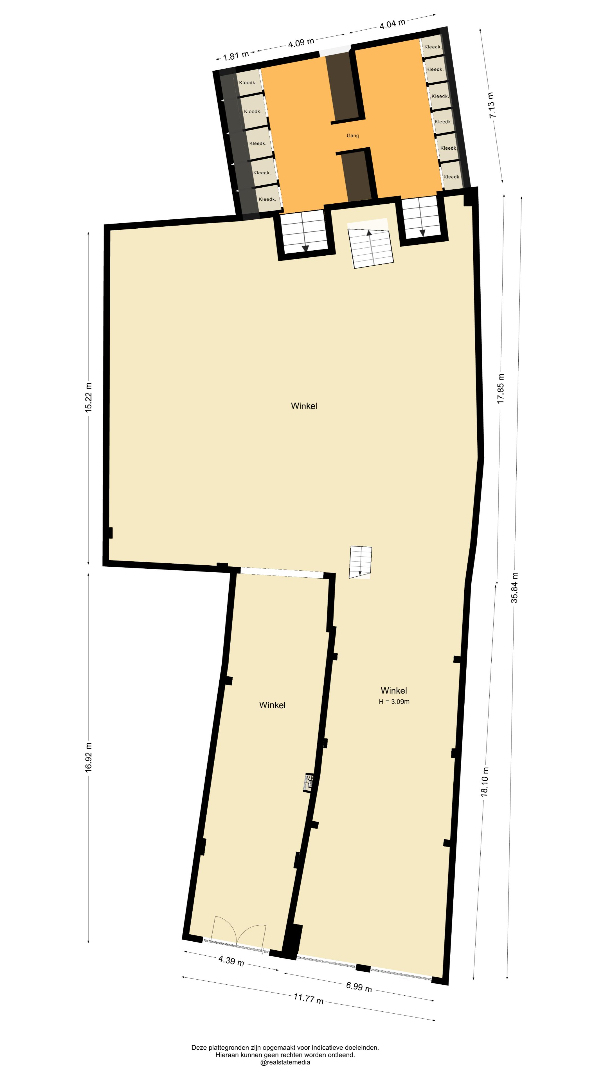 Verdeeld over meerdere bouwlagen, met een combinatie van winkelruimte en ondersteunende/facilitaire functies.