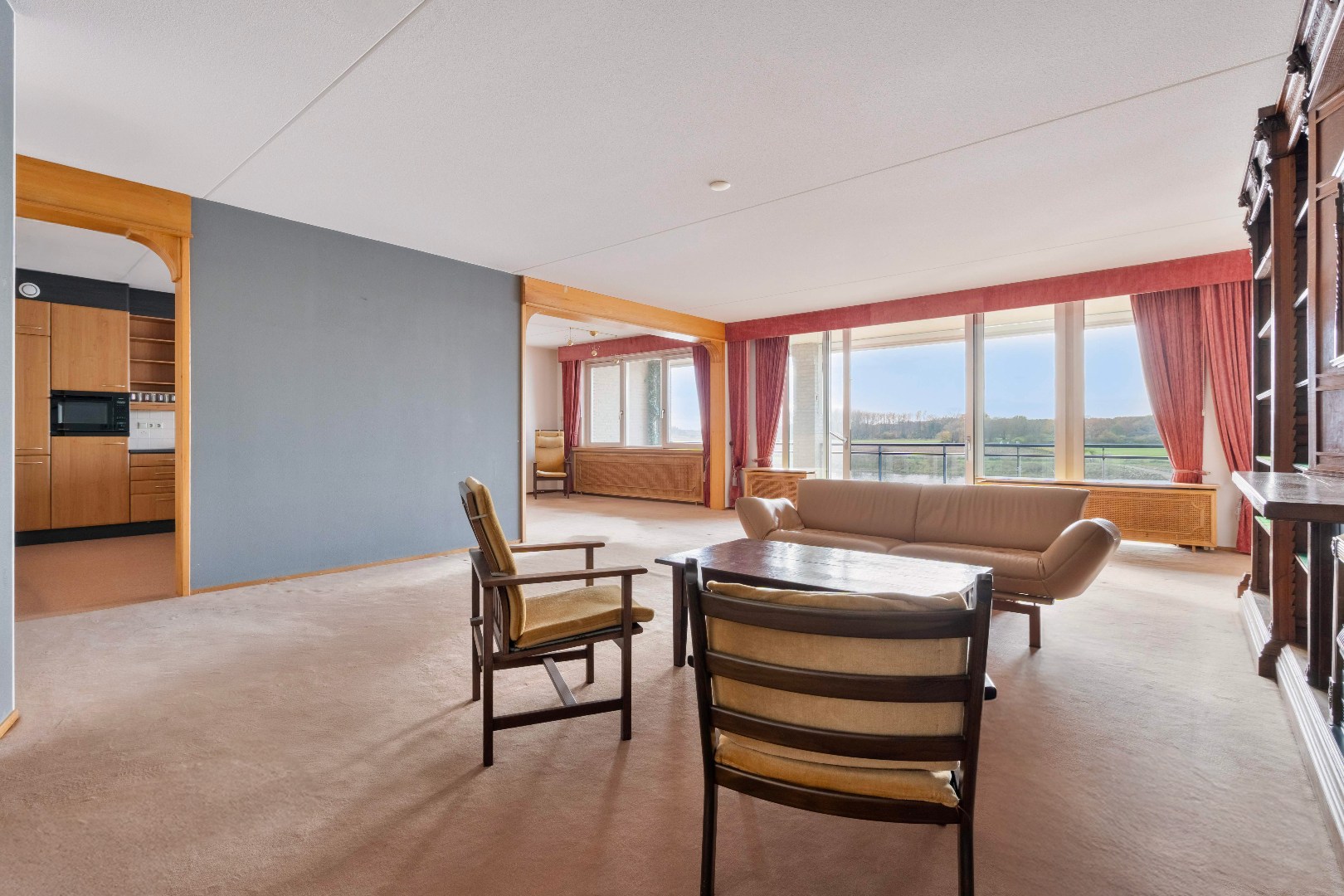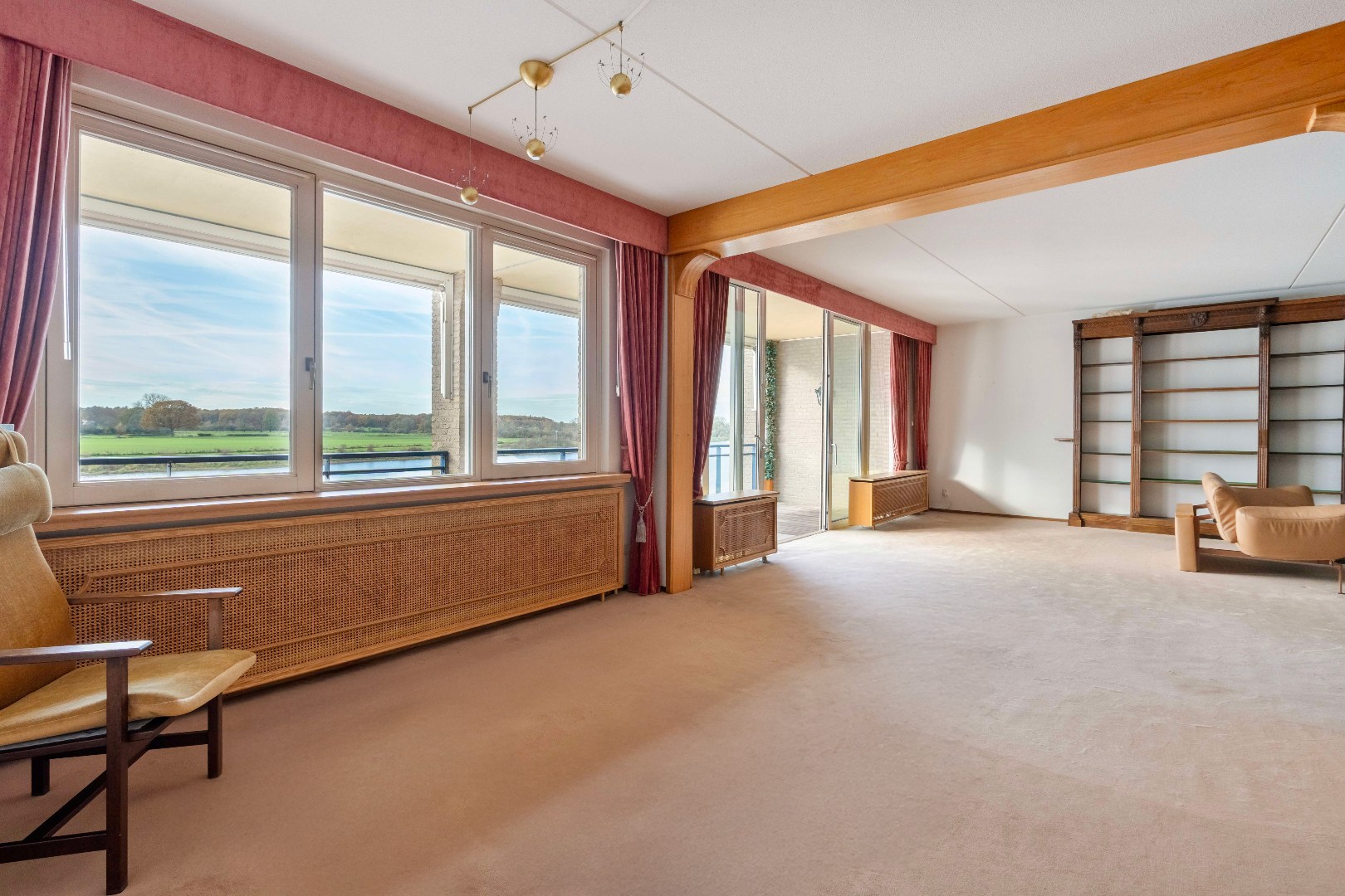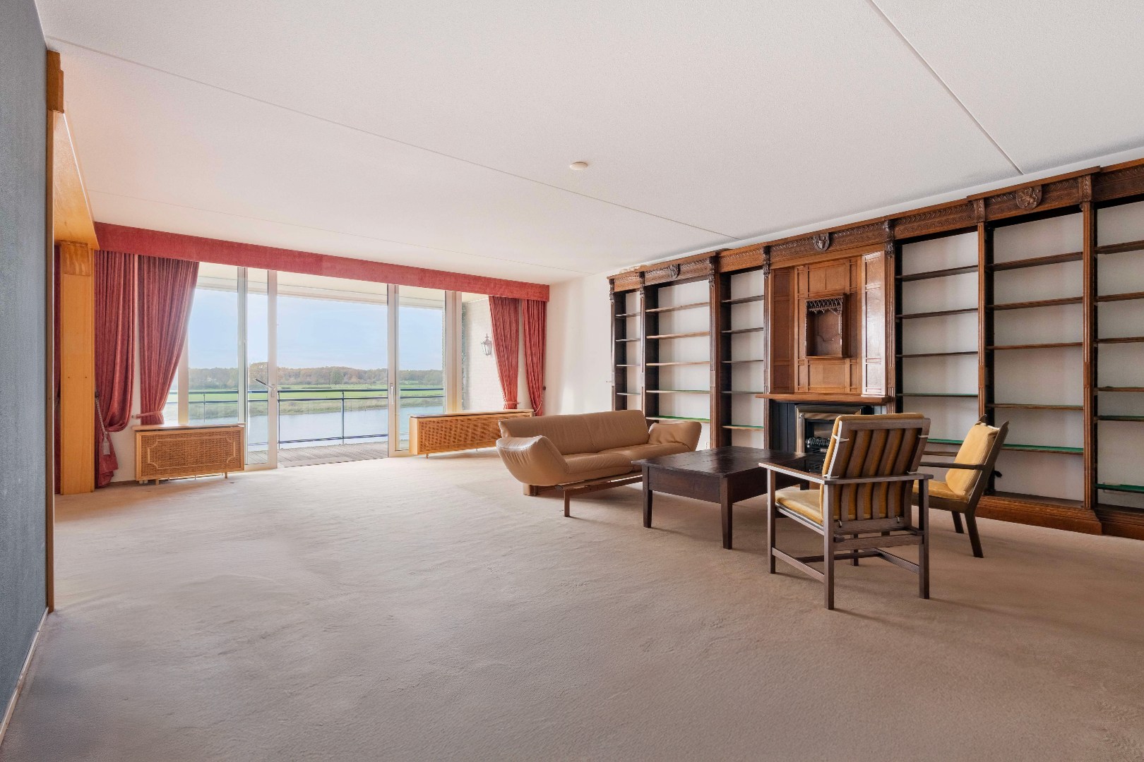 De riante woonkamer (ca. 65 m²) is een heerlijke leefruimte met grote ramen die zorgen voor veel lichtinval en een verbluffend uitzicht op de Maas. Via een schuifpui loopt u zo het balkon op.