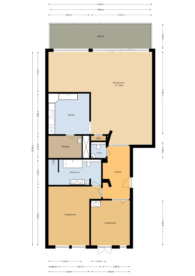 • De eerste slaapkamer (ca. 15.5 m²) aan de voorzijde heeft een Frans balkon en een eigen wastafelmeubel.