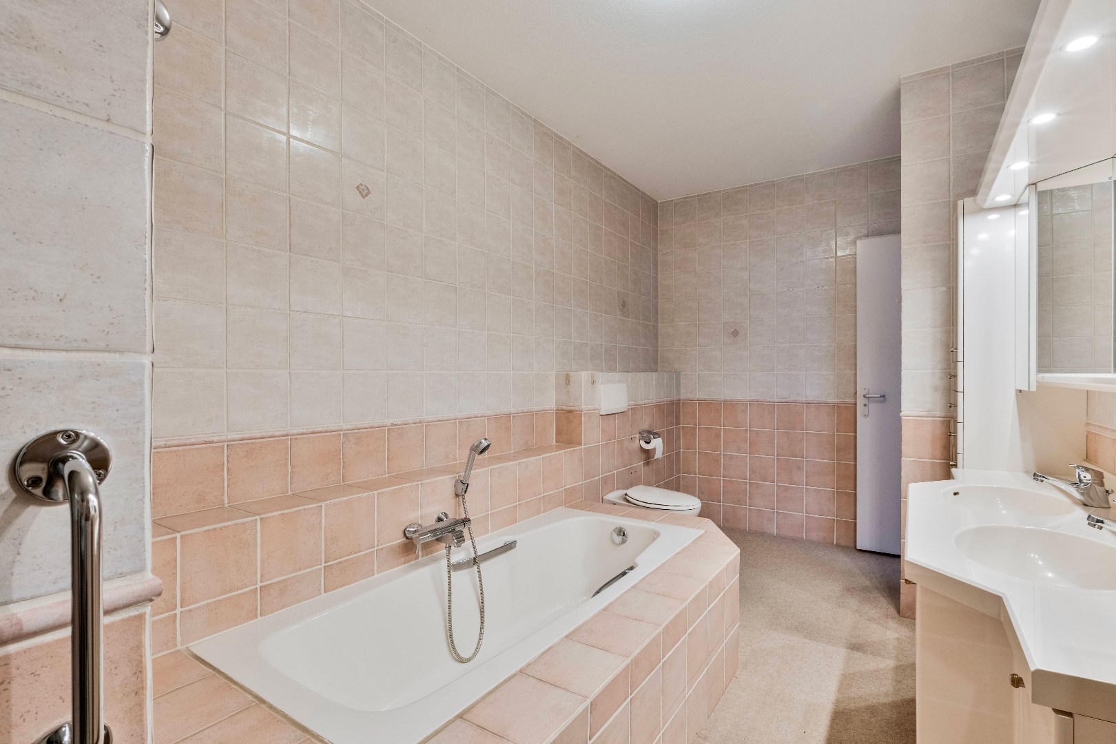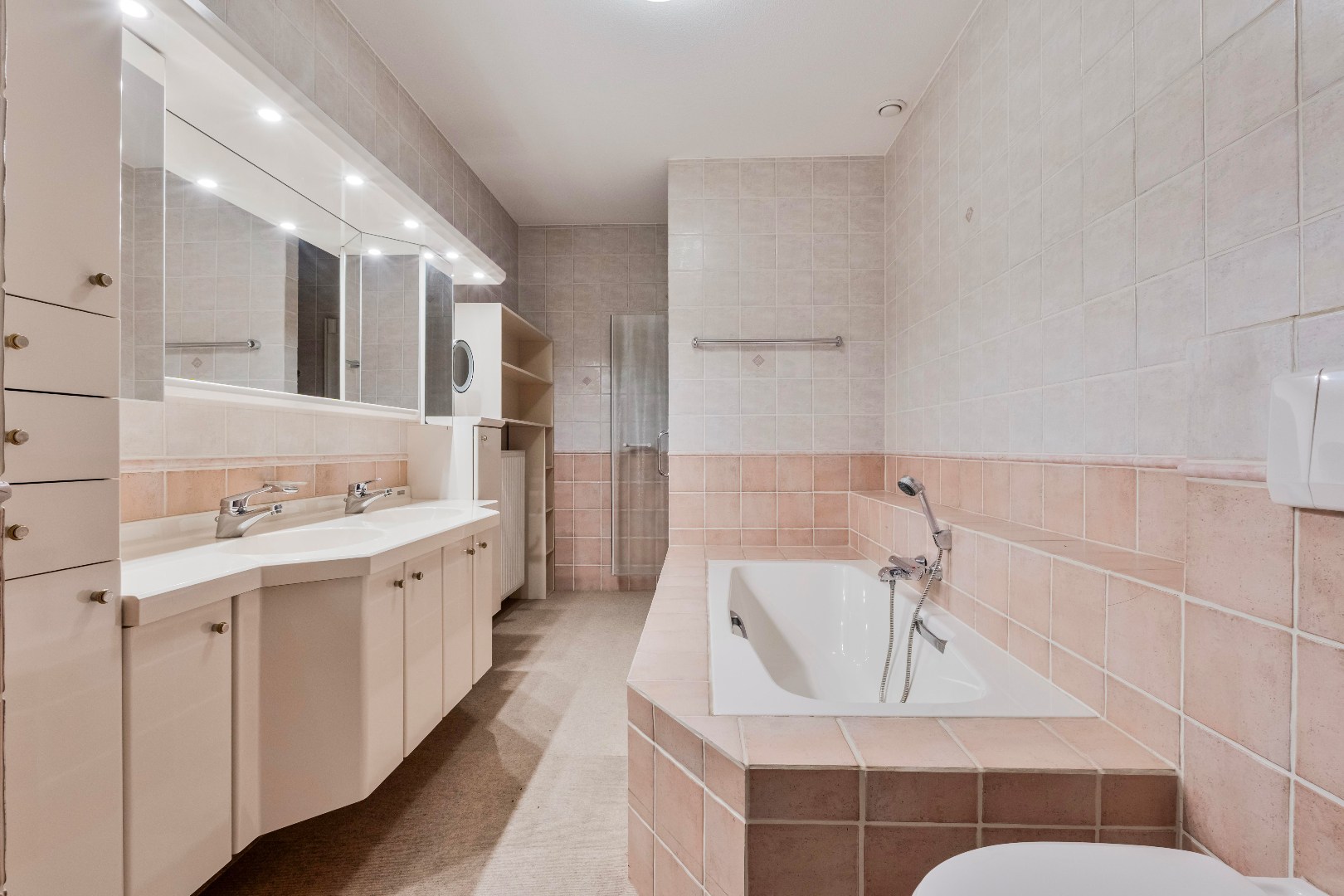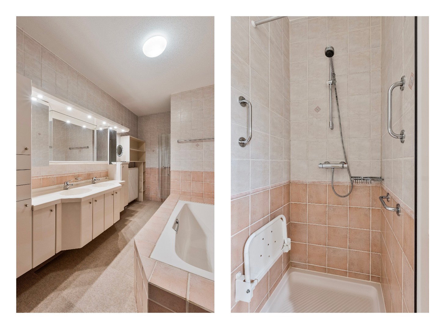 De badkamer (ca. 12 m²) is zeer ruim ingericht met een ligbad, inloopdouche, dubbele wastafel met boven- en beneden kasten en een tweede zwevend toilet.
