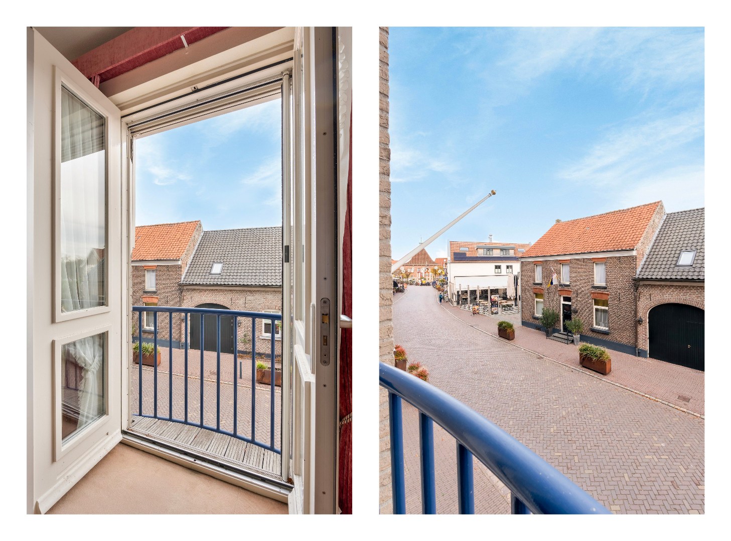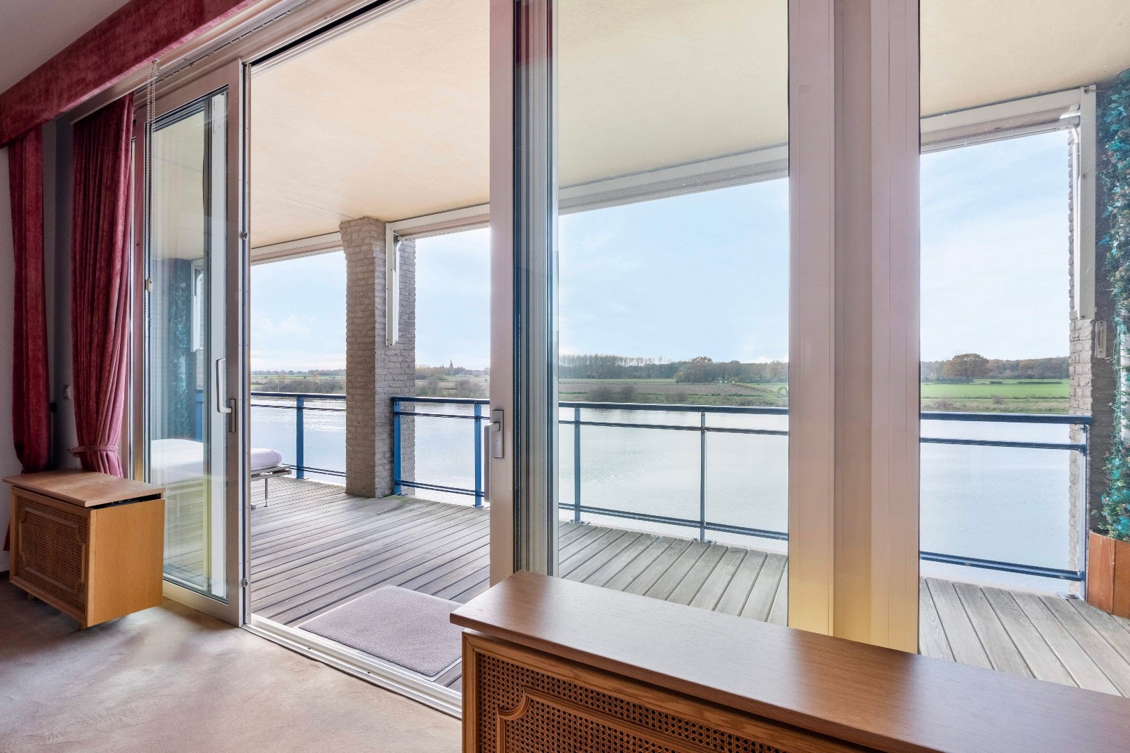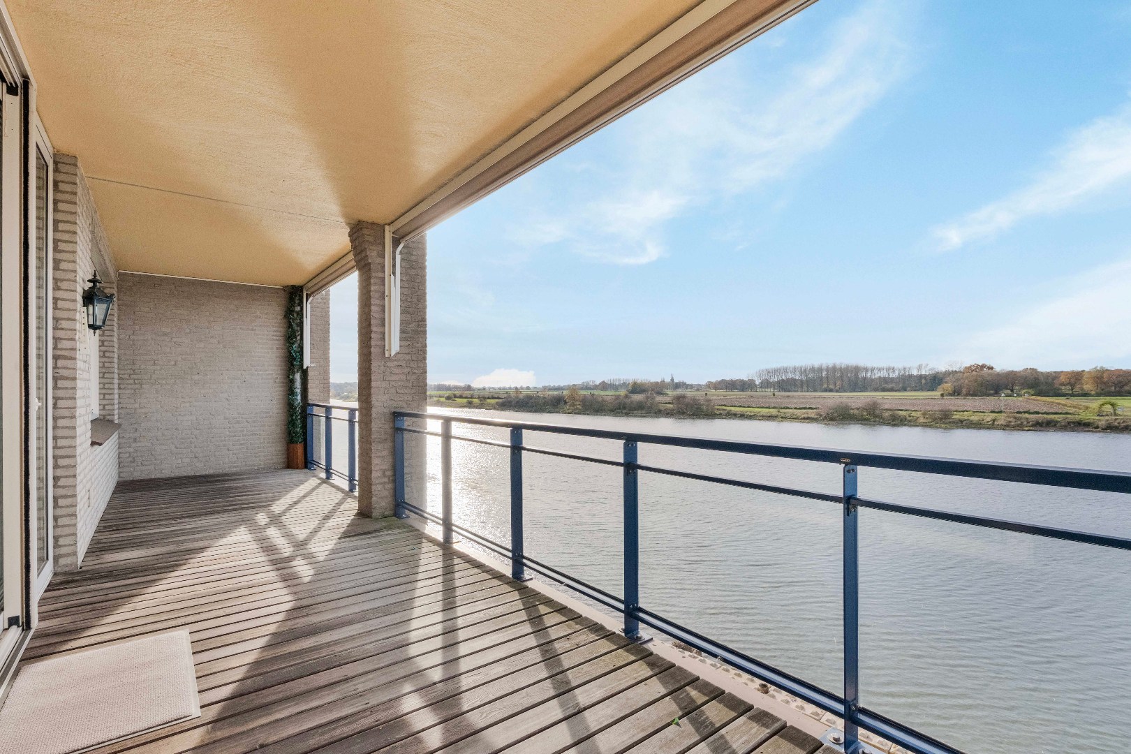 Het balkon (ca. 22 m²) vormt een verlengstuk van de woonkamer. Dankzij het zonnescherm, buitenverlichting en de ruime opzet is dit een ideale plek om te ontspannen en te genieten van het fraaie uitzicht over de Maas.