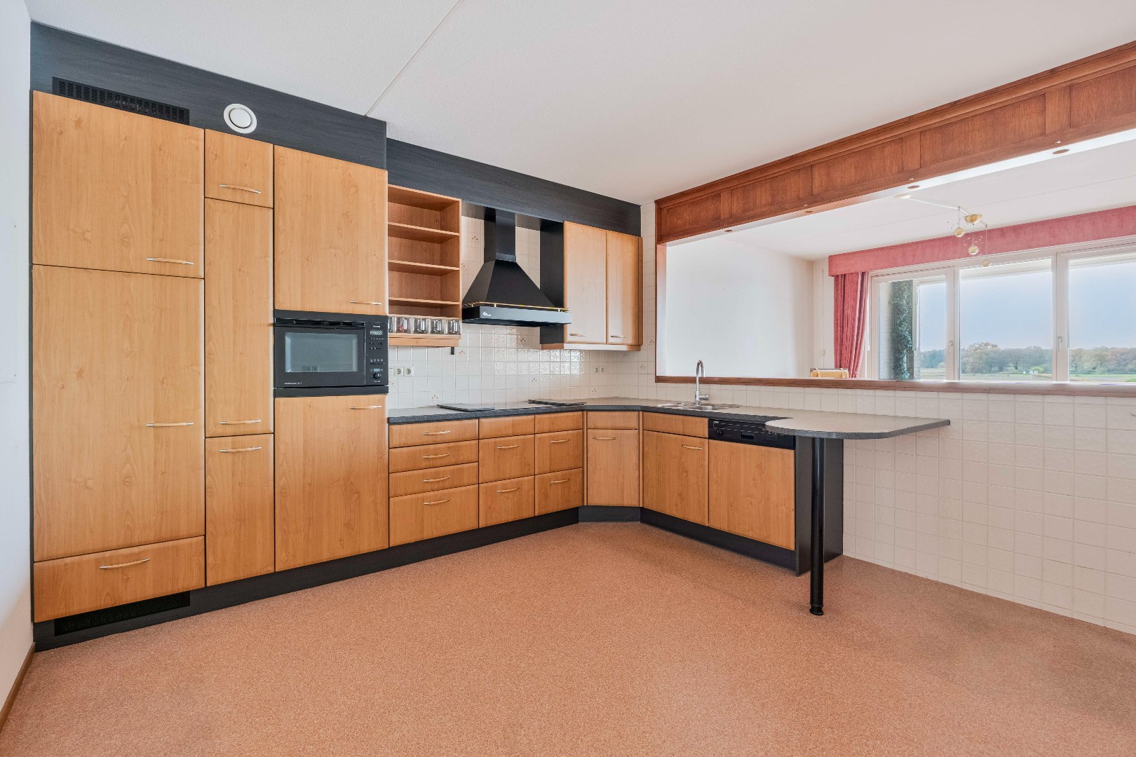 De ruime, halfopen keuken (ca. 15 m²) is praktisch ingericht en voorzien van boven- en beneden kasten, een barretje en diverse inbouwapparatuur: inductiekookplaat, afzuigkap, vaatwasser, koelkast met vriesvak en volop bergruimte. Direct aangrenzend vindt u een handige bijkeuken (ca. 6.5 m²) met witgoedaansluitingen .