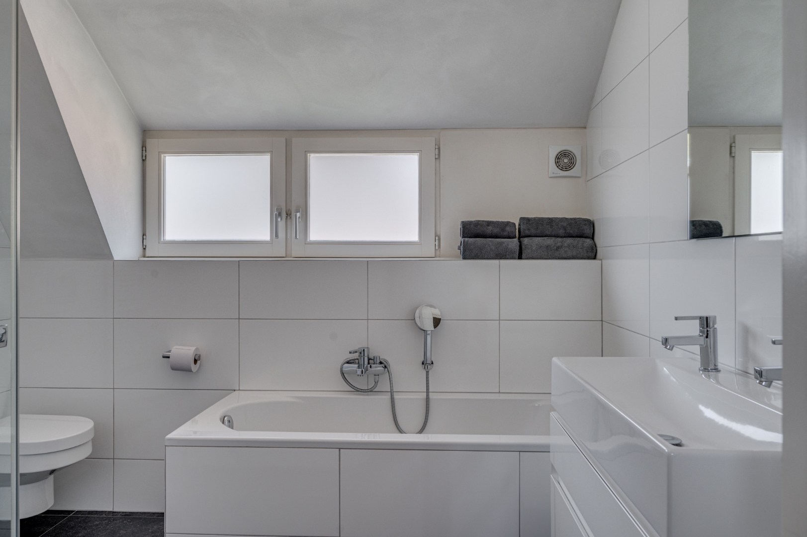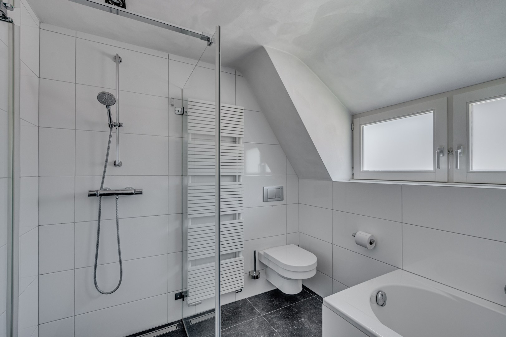 - De badkamer (ca. 6m2) is compleet en tijdloos ingericht, voorzien van een ligbad, douchecabine, hangcloset en een grote wastafel met meubel.