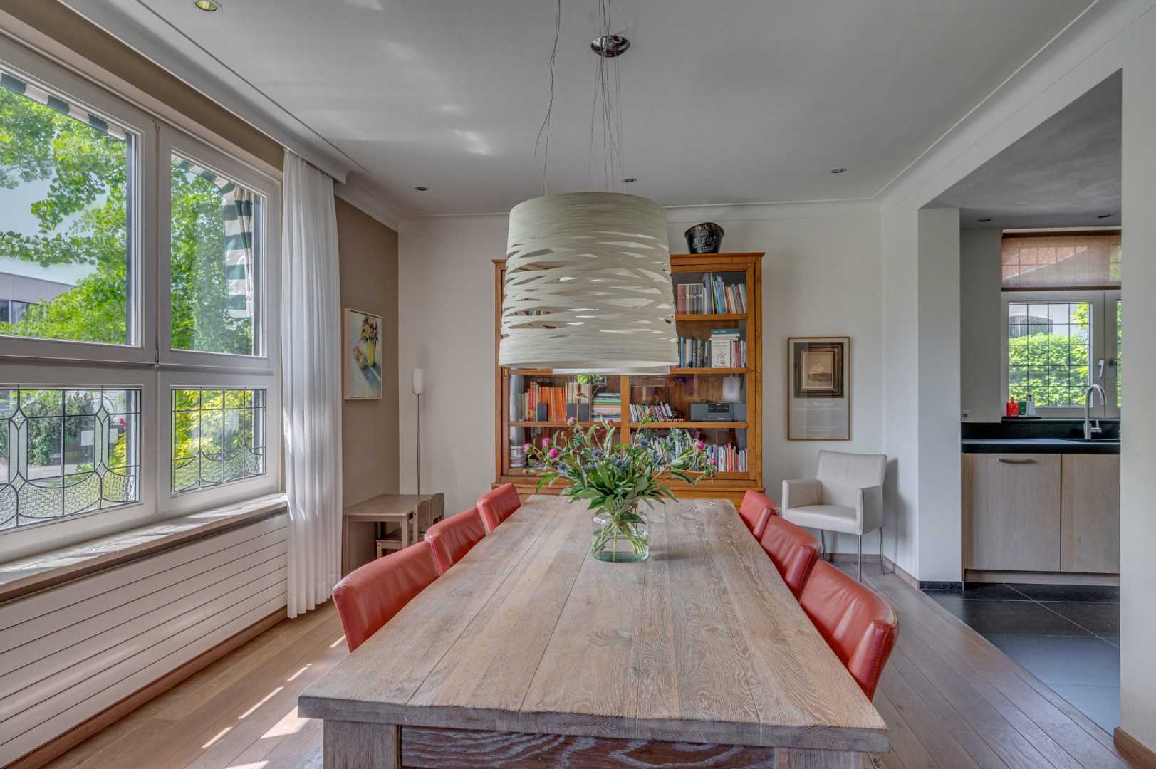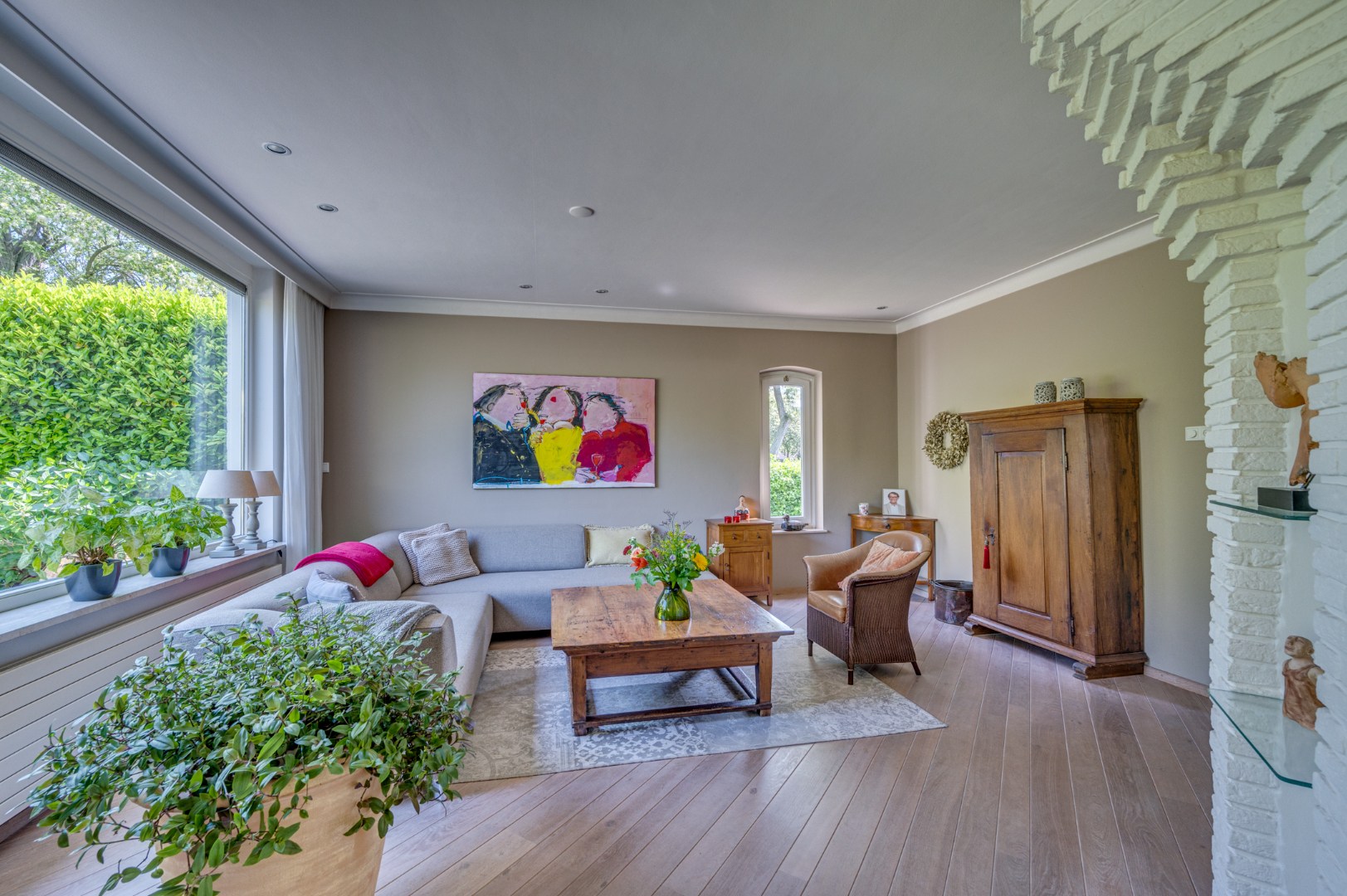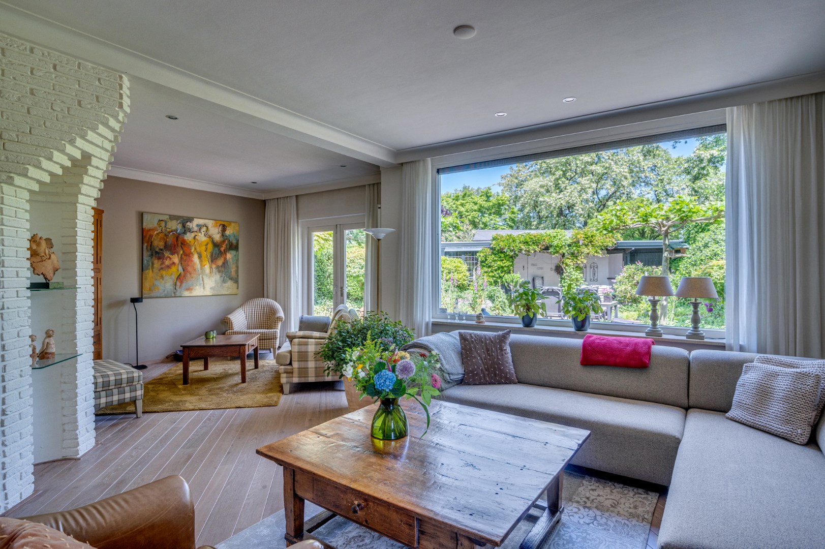 - De woonkamer (ca. 33,5m2) straalt warmte en gezelligheid uit met een diagonaal gelegde houten vloer. Grote ramen en openslaande deuren zorgen voor veel licht en uitzicht op de fraai aangelegde tuin.