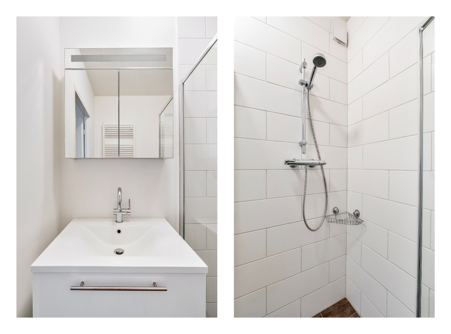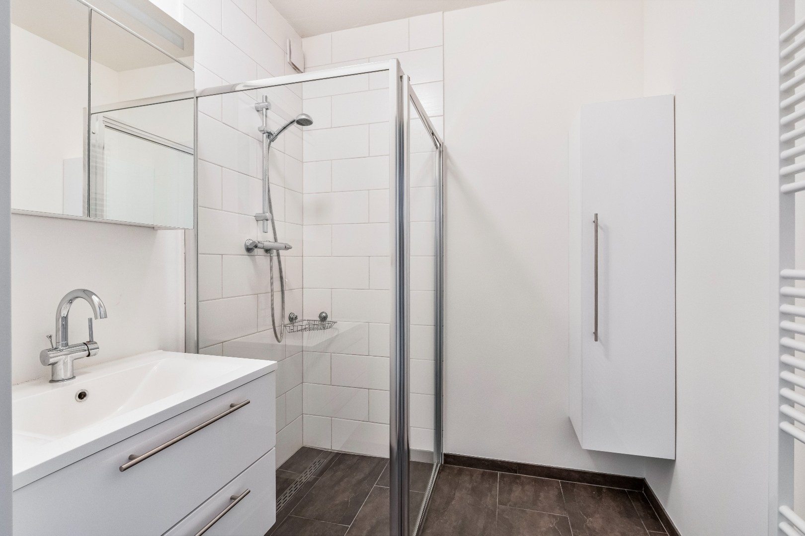 - De moderne badkamer (eveneens uit 2018) beschikt over een ruime douchecabine, wastafelmeubel, spiegelkast en designradiator.