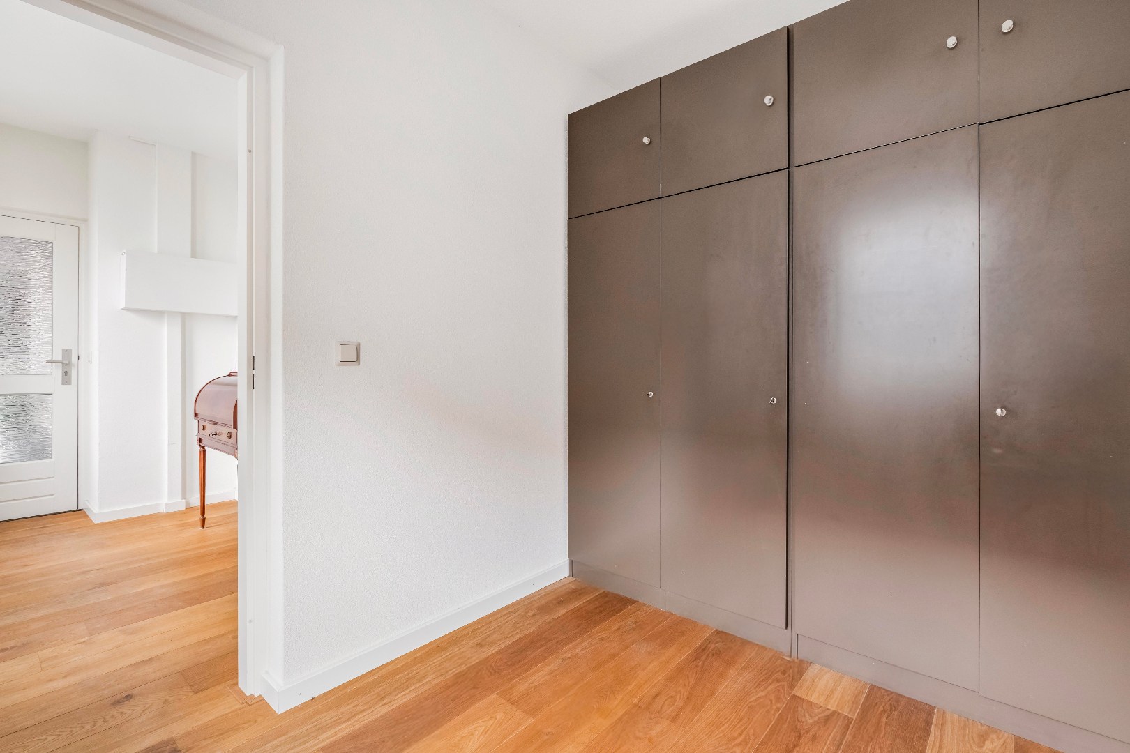 - Via de keuken is de bijkeuken bereikbaar, voorzien van een aanrechtblad boven de witgoedaansluiting, extra kastruimte en cv-installatie.