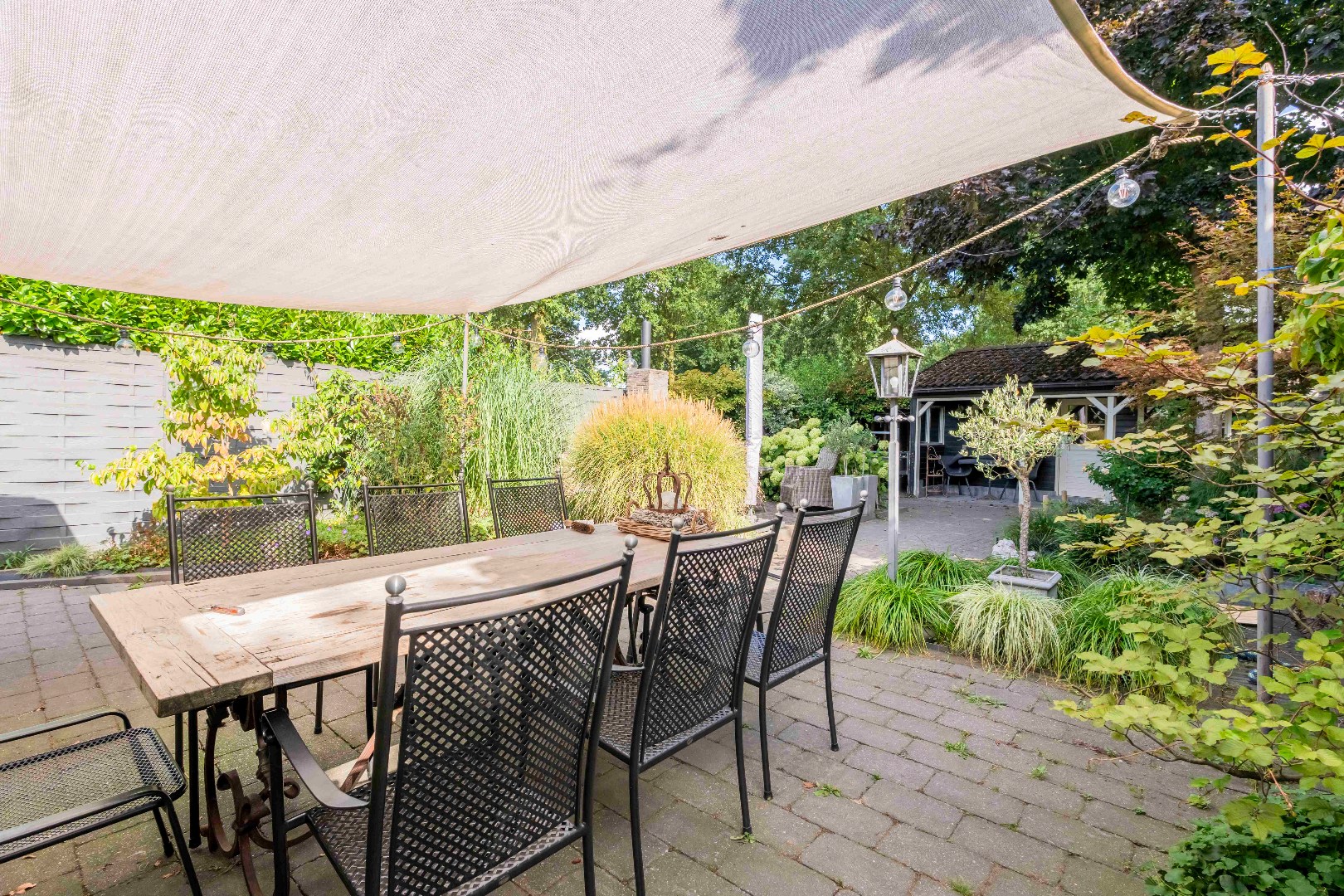 De achtertuin is royaal en biedt volop privacy en gebruiksmogelijkheden. De tuin beschikt over een achterom, een tuinhuisje en een tuinkamer van ca. 18 m² met schuifdeuren.