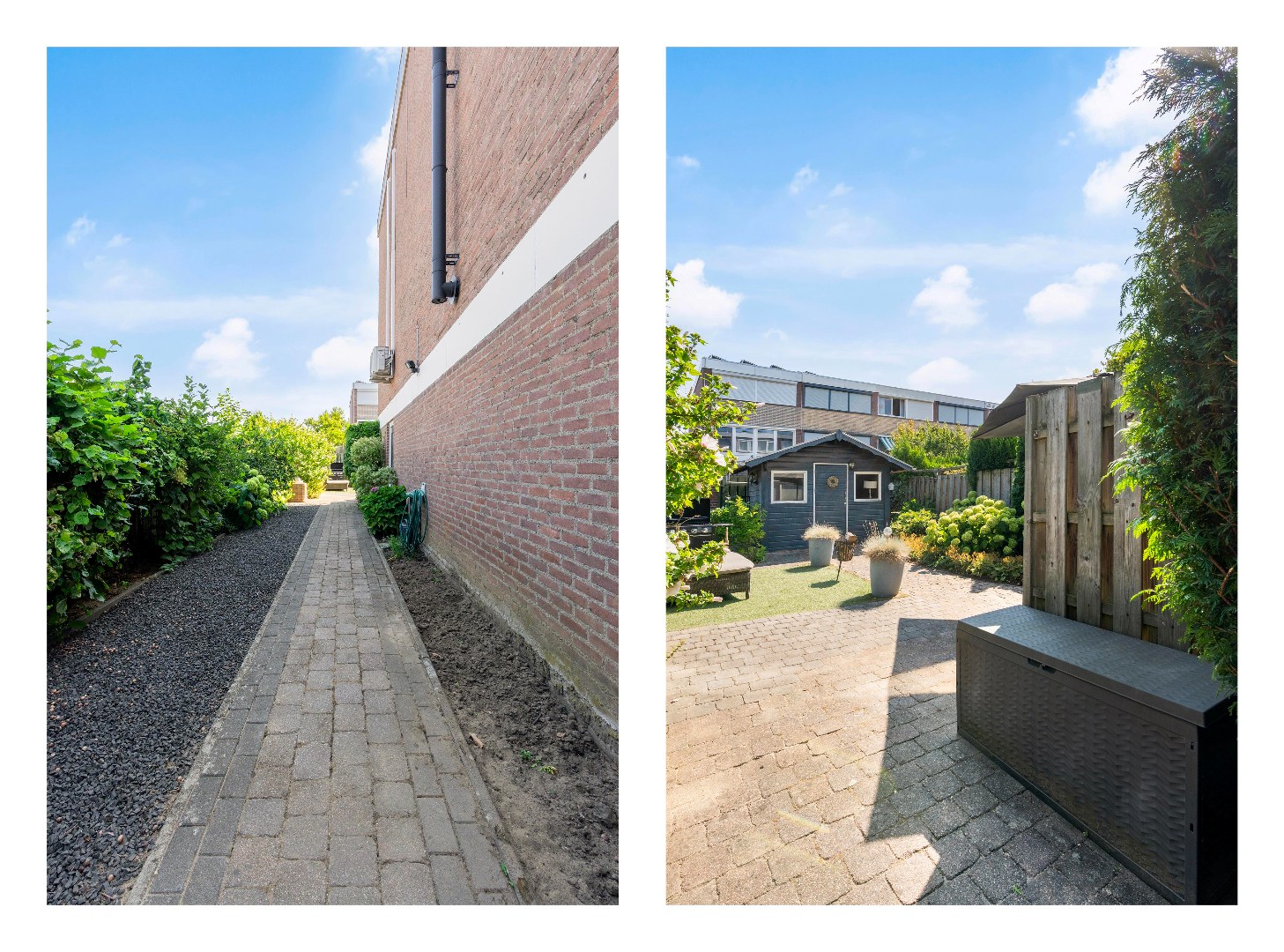 De achtertuin is verzorgd aangelegd met meerdere terrassen, borders, een gazon en een vrije achterom – ideaal voor fietsen, containers of gewoon als extra toegang. Dankzij de hoekligging geniet je van extra buitenruimte..