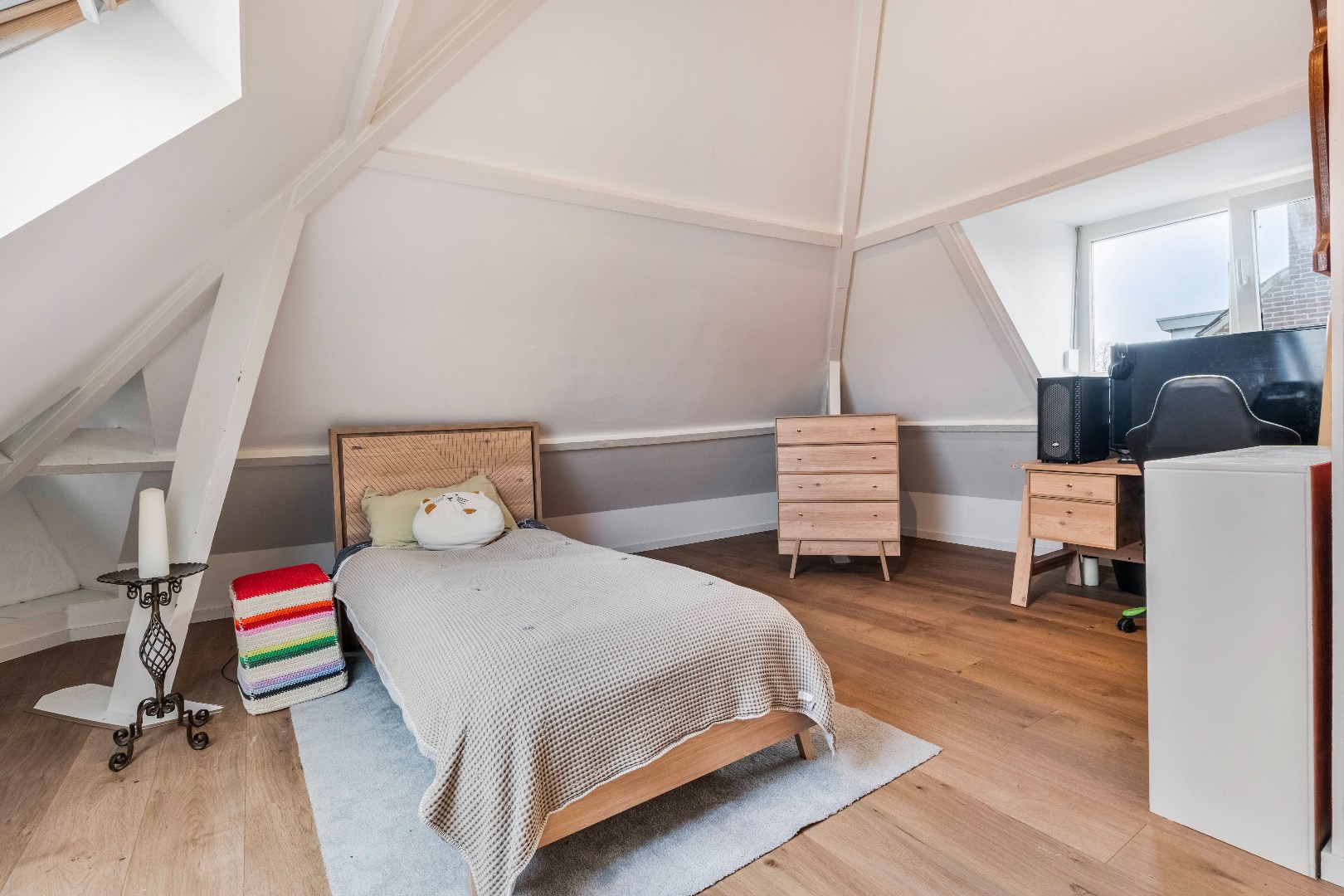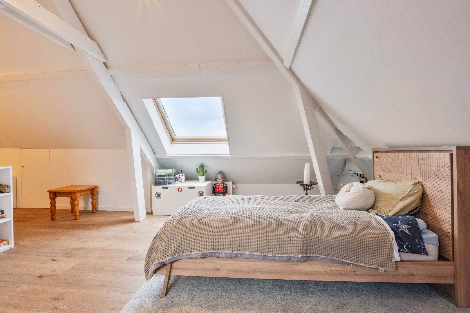 Wat deze verdieping extra bijzonder maakt, zijn de dubbele openslaande deuren in zowel de keuken als de eethoek. Deze geven toegang tot een sfeervol dakterras van ca. 29 m2.