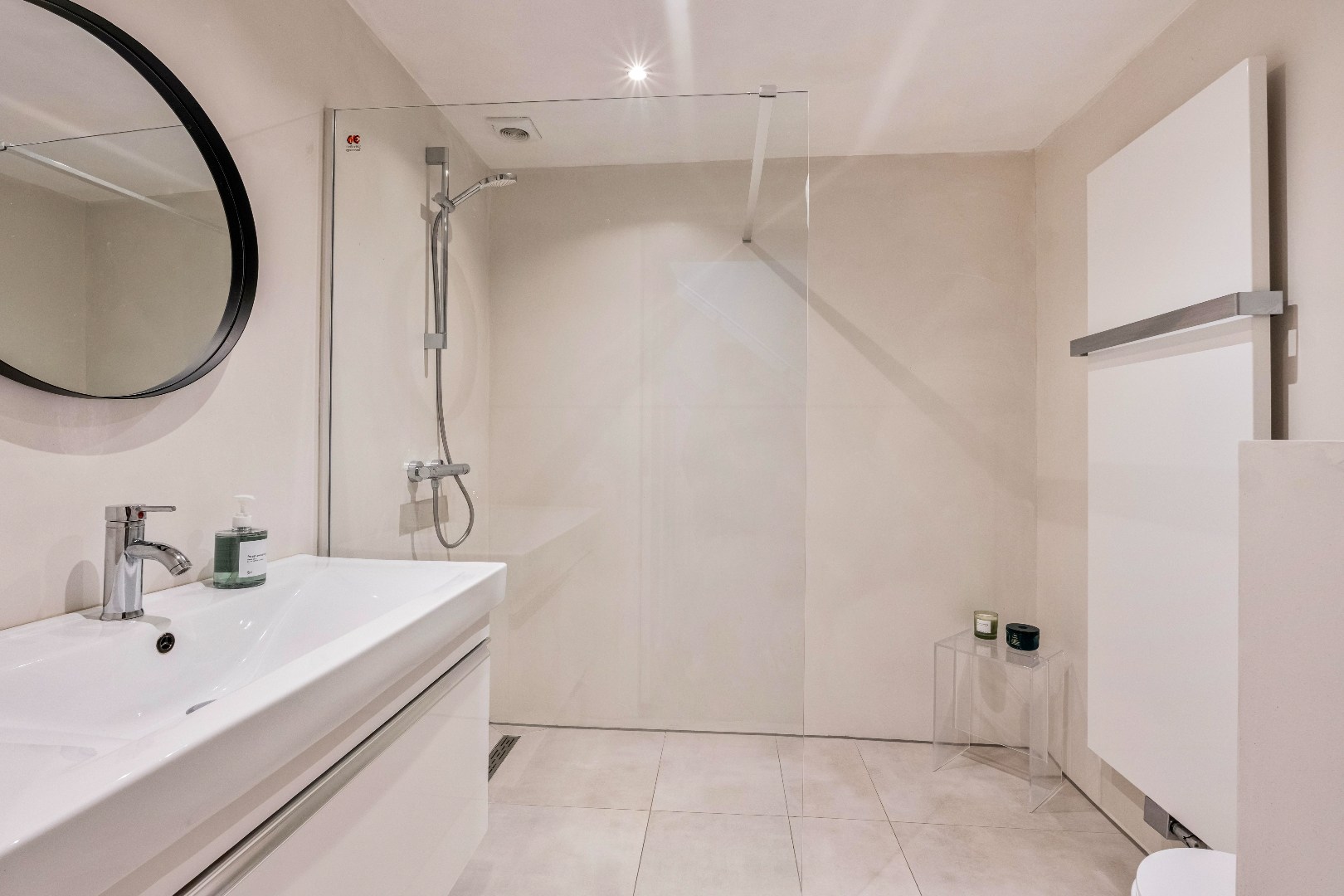 De luxe badkamer van ca 4.5 m2 bevindt zich even eens op de begane grond en is modern afgewerkt. Deze comfortabele ruimte is ingericht met een royale inloopdouche, een hangtoilet, een stijlvolle wastafelmeubelset en een designradiator die zorgt voor aangename warmte en een luxe uitstraling.