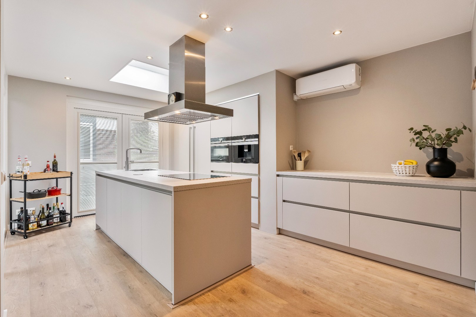 De open woonkeuken vormt een stijlvol middelpunt van de woonruimte en is volledig uitgerust met alle benodigde apparatuur. Denk hierbij aan een 4-pits inductiekookplaat, een afzuigkap, combi-oven met grill, koelkast, vriezer, vaatwasser en zelfs een ingebouwd koffiezetapparaat.