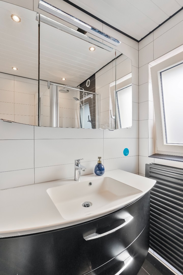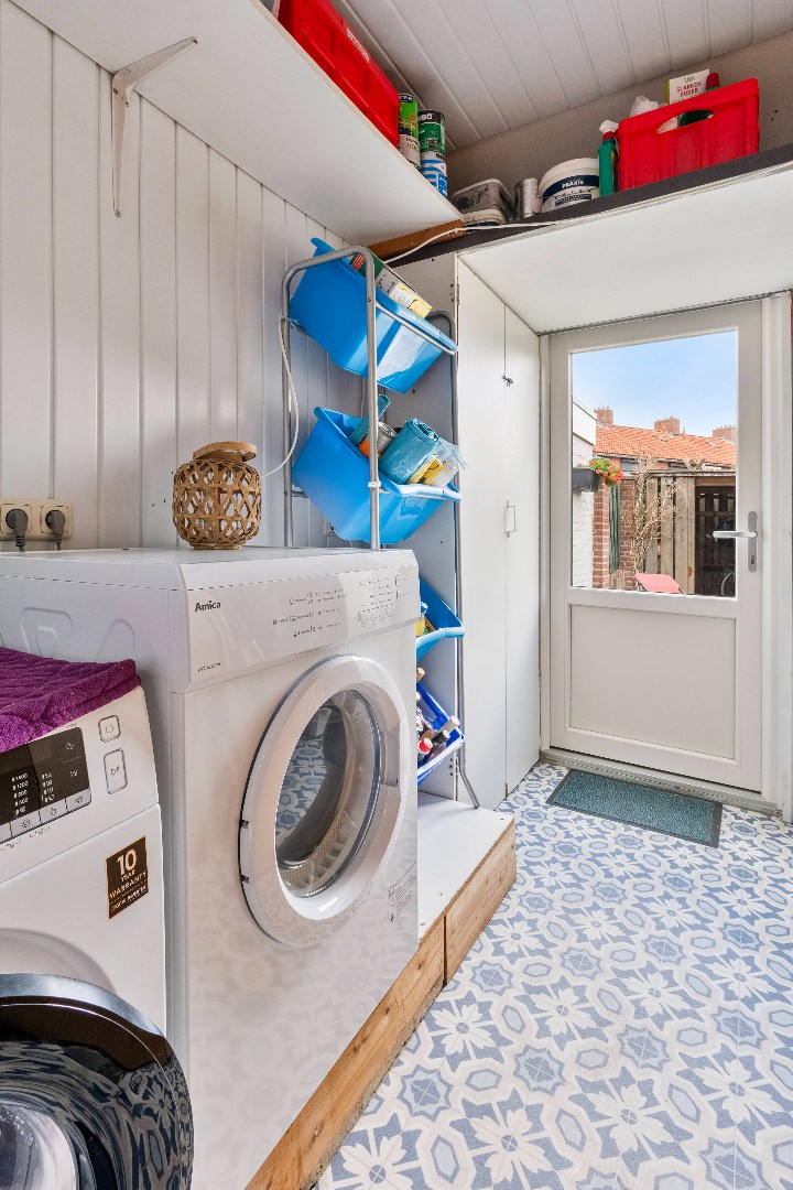 De keuken van ca. 18m2 bevindt zich aan de achterzijde van de woning en is uitgerust met een 4-pits gaskookplaat, afzuigkap, oven en koelkast. Vanuit de keuken bereik je de tuin, zowel via de schuifpui als via de naastgelegen berging van ca. 6m2. In de berging vind je de witgoedaansluitingen en extra bergruimte, met ook een directe doorgang naar de tuin.