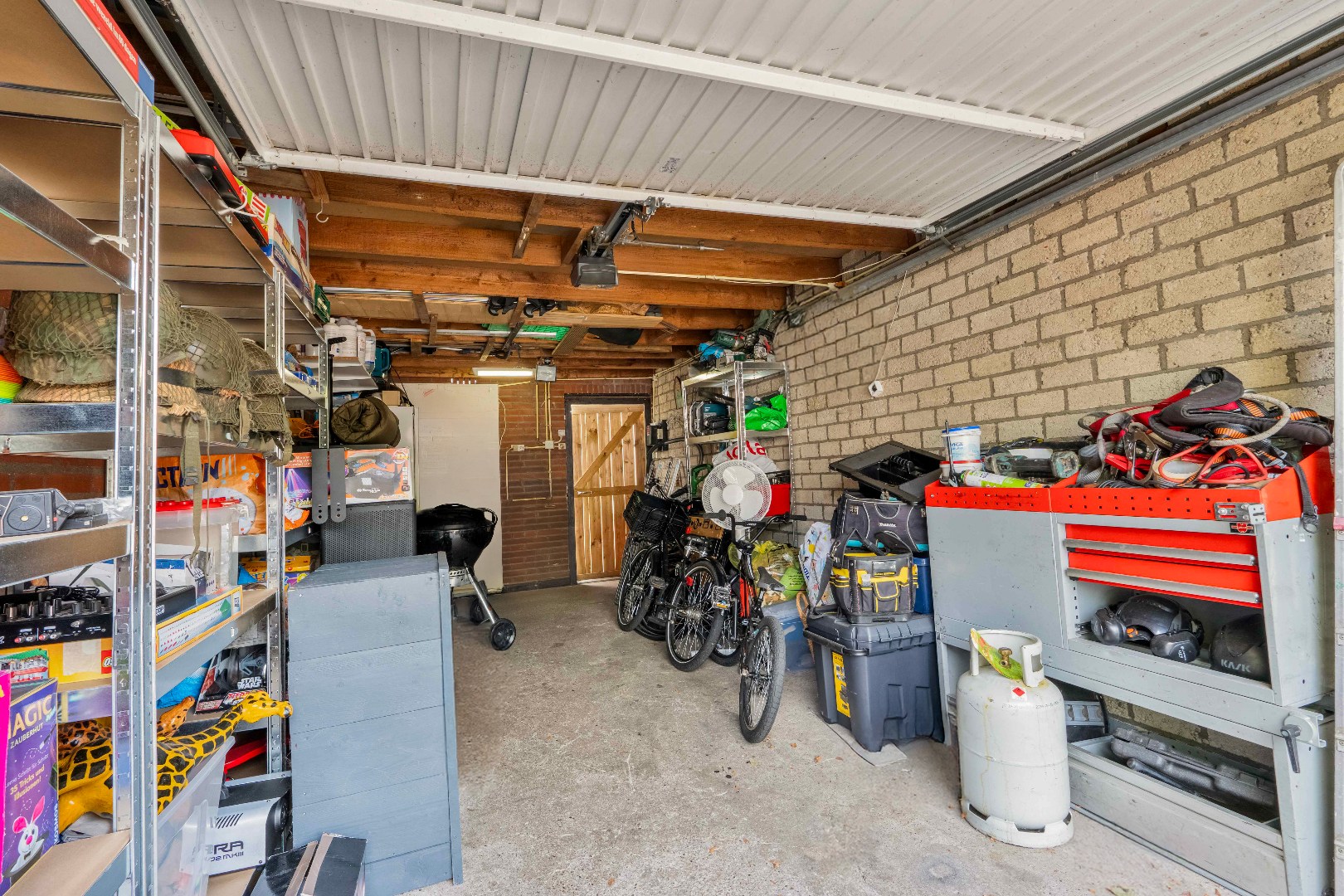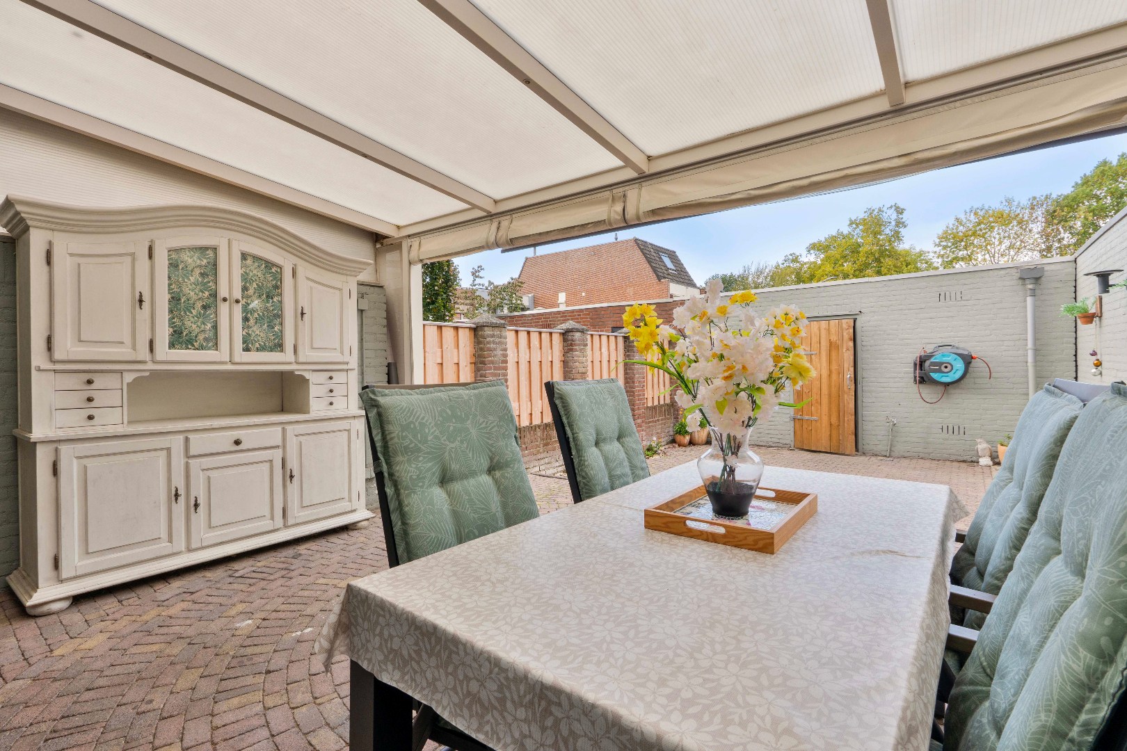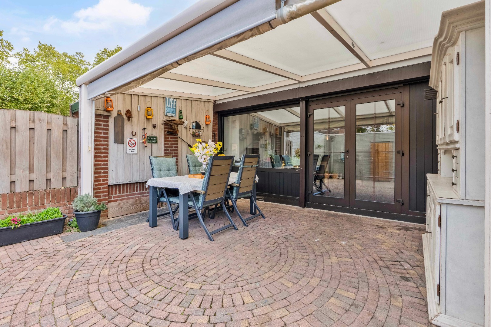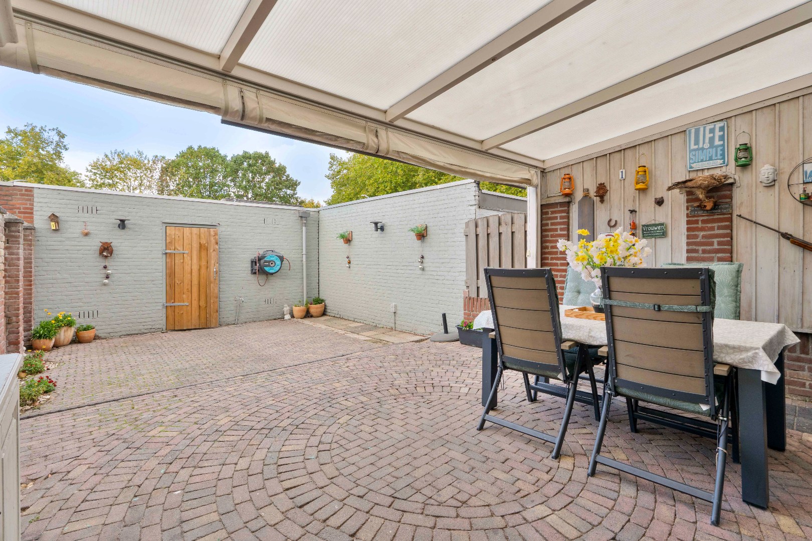 De achtertuin is onderhoudsvriendelijk aangelegd met sierbestrating en beschikt over een ruime overkapping, ideaal voor een eettafel of loungehoek. De tuin is volledig omsloten door gemetselde muren en een houten schutting, wat zorgt voor optimale privacy. Vanuit de tuin is de garage van Ca. 21 m2 met elektrische rolpoort bereikbaar. Verder zijn er vaste plantenbakken en ophangpunten voor beplanting of decoratie aanwezig.