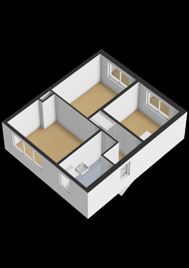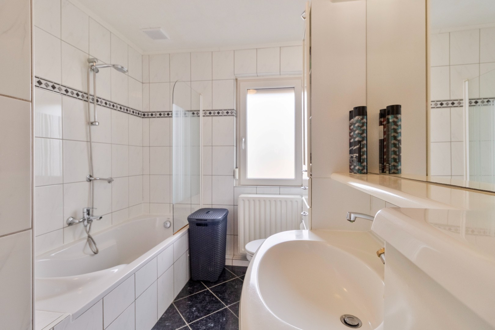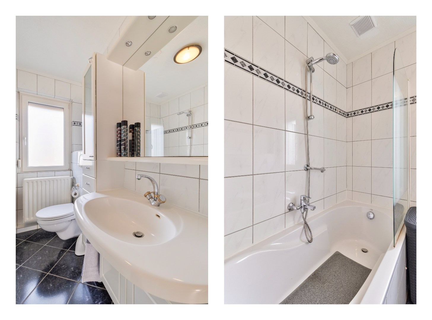 Overloop met toegang tot drie slaapkamers van ca. 11,5m2, 12m2 en 9m2, allemaal voorzien van kunststof kozijnen met rolluiken en laminaatvloer. De badkamer beschikt over een bad-/douchecombinatie, een zwevend toilet en een badkamermeubel met wastafel.