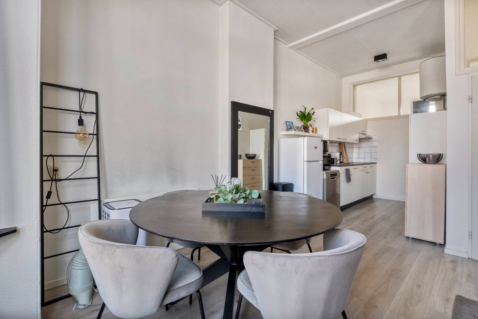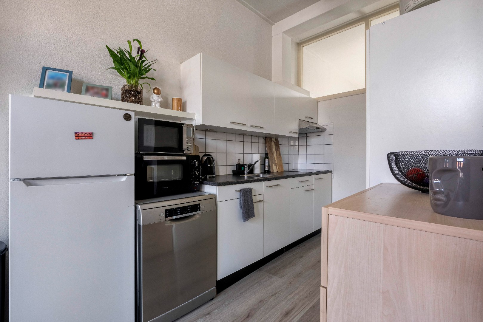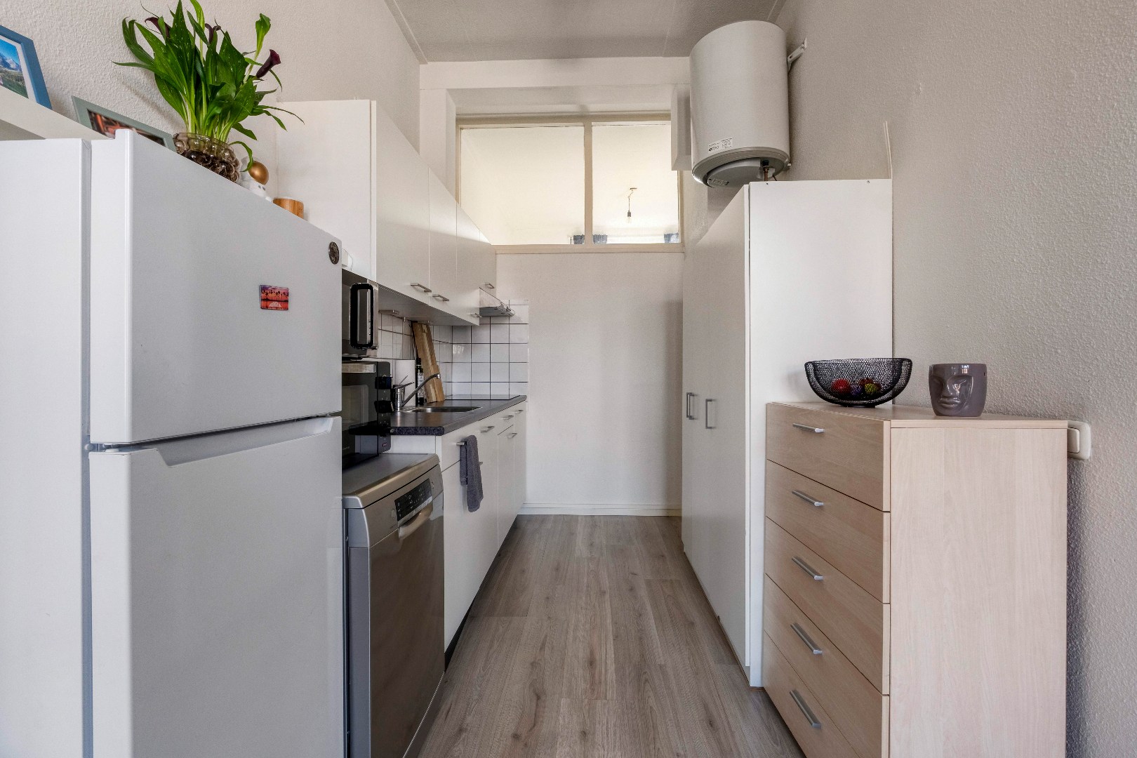 Via de hal is toegang tot de woonkamer met open keuken, de badkamer en de slaapkamer. De woonkamer (16 m2) sluit aan op de open keuken (7 m2) die is uitgerust met een inductiekookplaat en afzuigkap.
