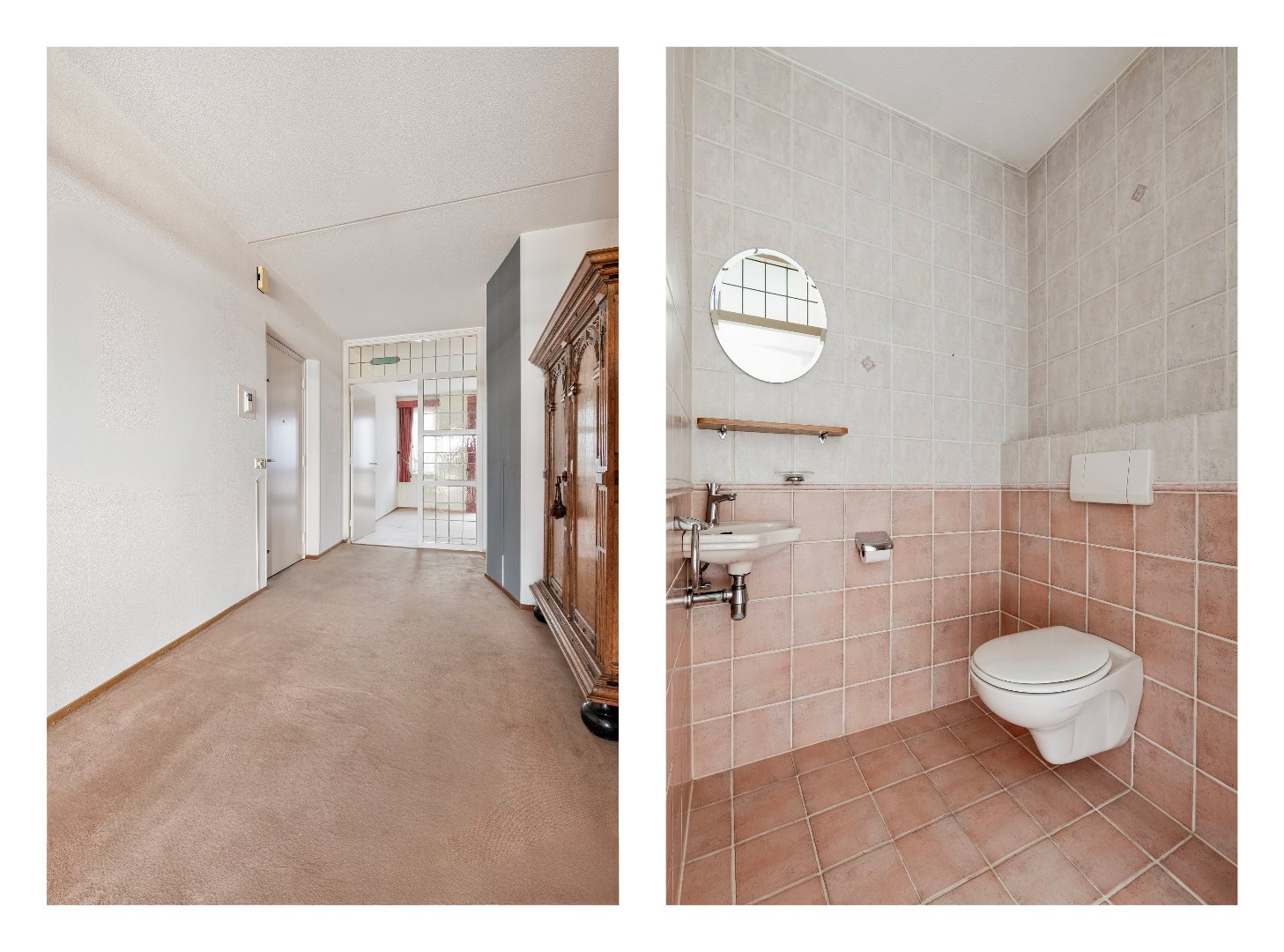 Via de voordeur betreedt u een grote ontvangsthal met garderoberuimte en meterkast. De hal geeft toegang tot alle vertrekken en beschikt over een ruime toiletruimte met zwevend closet en fontein, volledig betegeld.