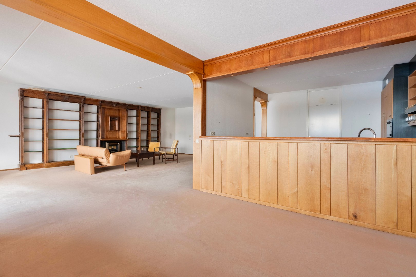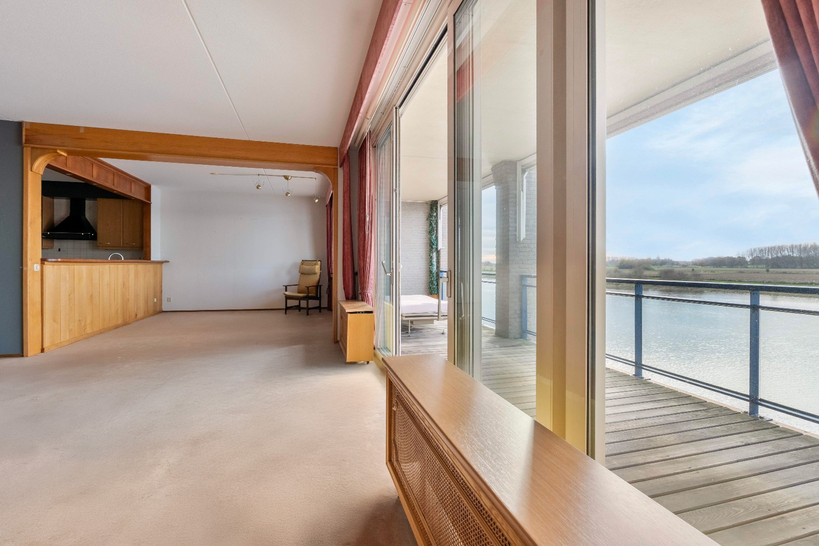 De riante woonkamer (ca. 65 m²) is een heerlijke leefruimte met grote ramen die zorgen voor veel lichtinval en een verbluffend uitzicht op de Maas. Via een schuifpui loopt u zo het balkon op.