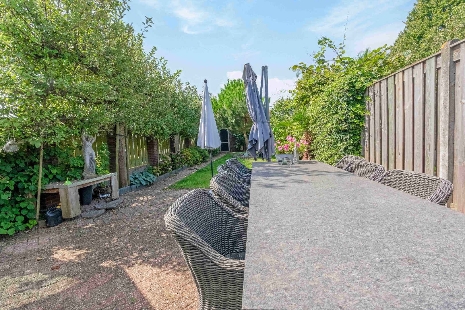 De diepe achtertuin ligt op het zuidoosten, loopt in de lengte door aan de rechterkant van het huis en is bereikbaar via de voor- en achterzijde. Achter in de tuin bevindt zich een ruime garage met rolpoort.