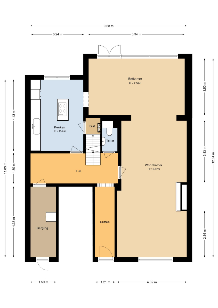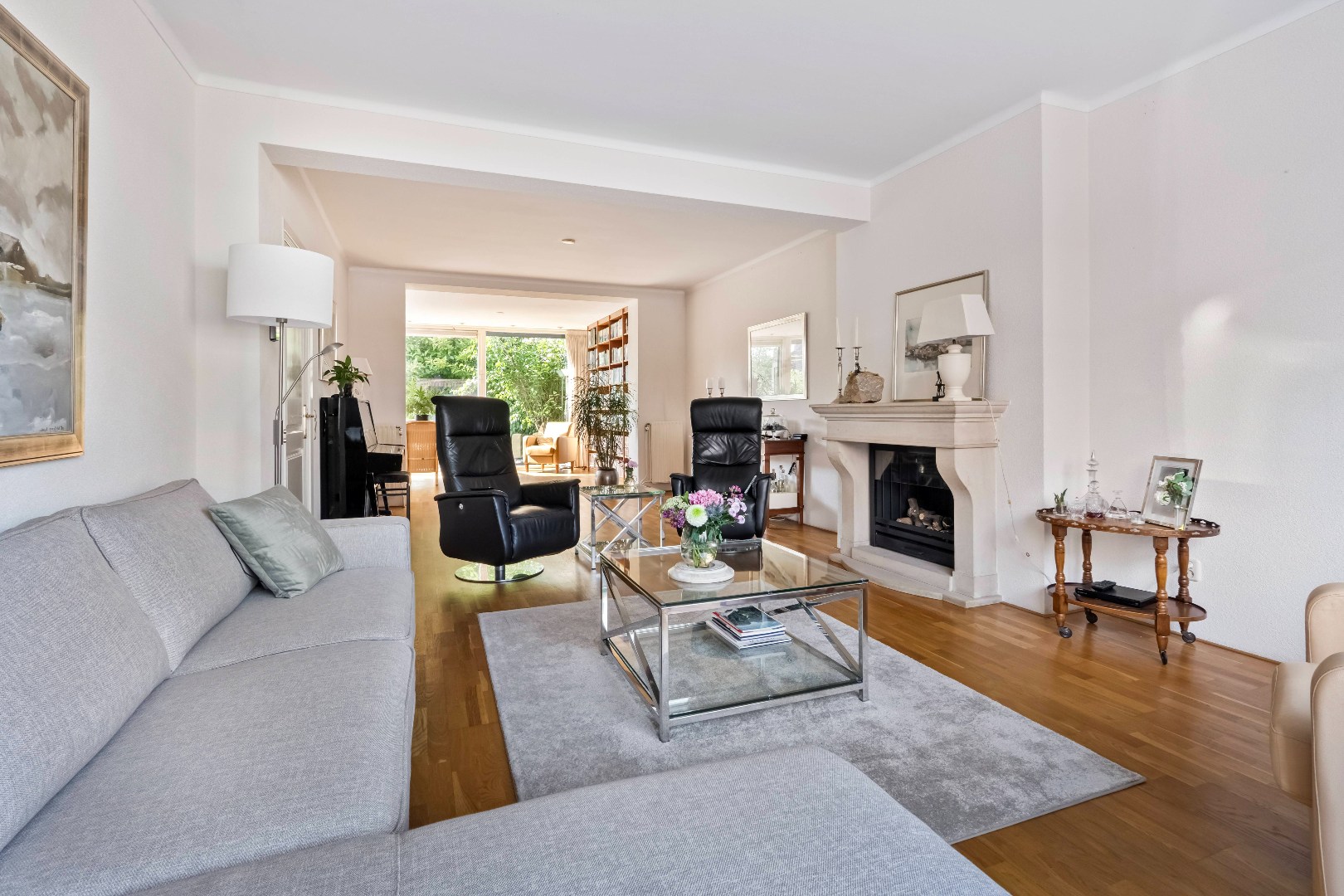Via de entree kom je in de lichte hal met toegang tot een modern toilet (2024), trapkast en royale berging met eigen toegang tot de straat. Vanuit de hal zijn ook de woonkamer en keuken bereikbaar. De woonkamer (ca. 38 mm) met sfeervolle gashaard heeft een open verbinding met de eetkamer (20,5 m2) en biedt via openslaande deuren toegang tot de achtertuin. De begane grond is voorzien van een stijlvolle parketvloer en rolluiken (2024). Aan de achterzijde bevindt zich de uitgebouwde keuken (14,5 m2), compleet met kookeiland, granieten werkblad en inbouwapparatuur zoals keramische kookplaat, afzuigkap, combi-oven/magnetron, koelkast en vaatwasser.