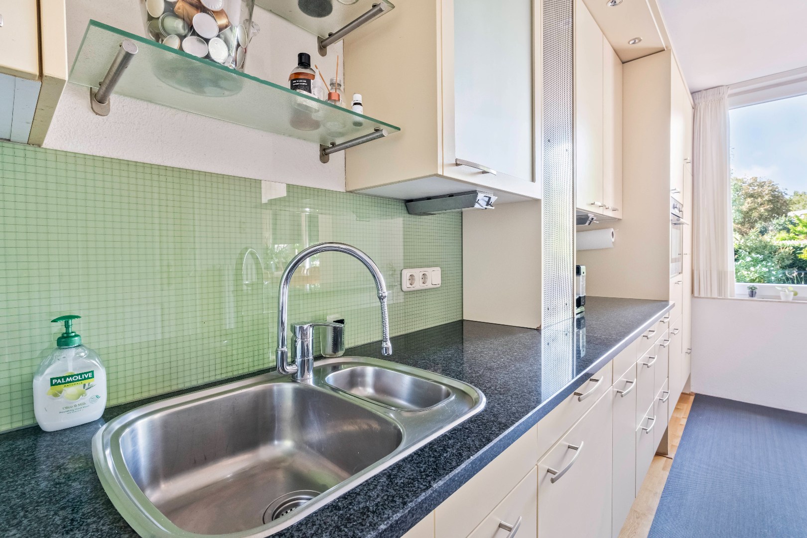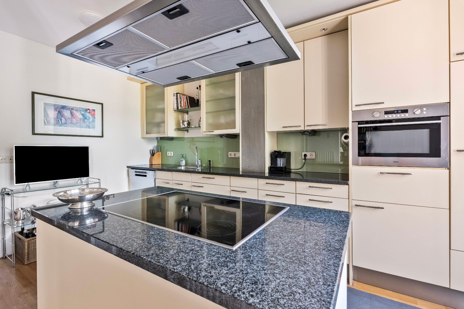 1. ingerichte keuken met kookeiland en diverse keukenapparatuur