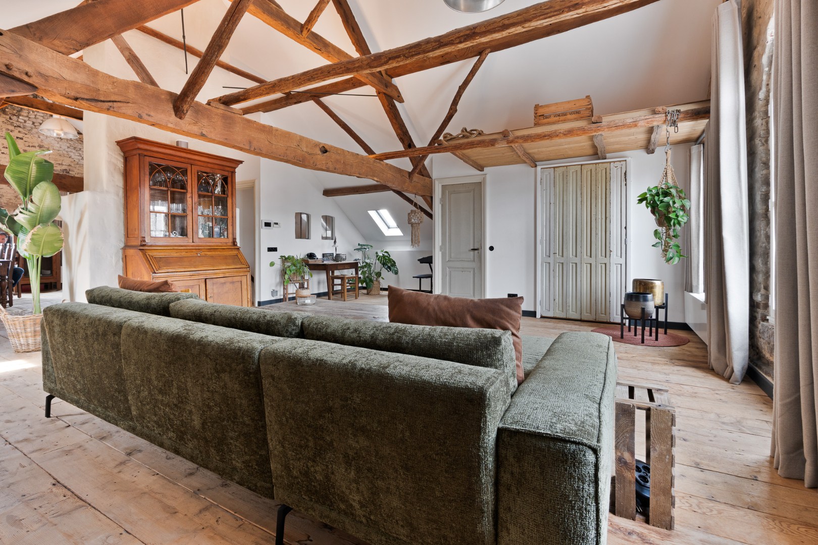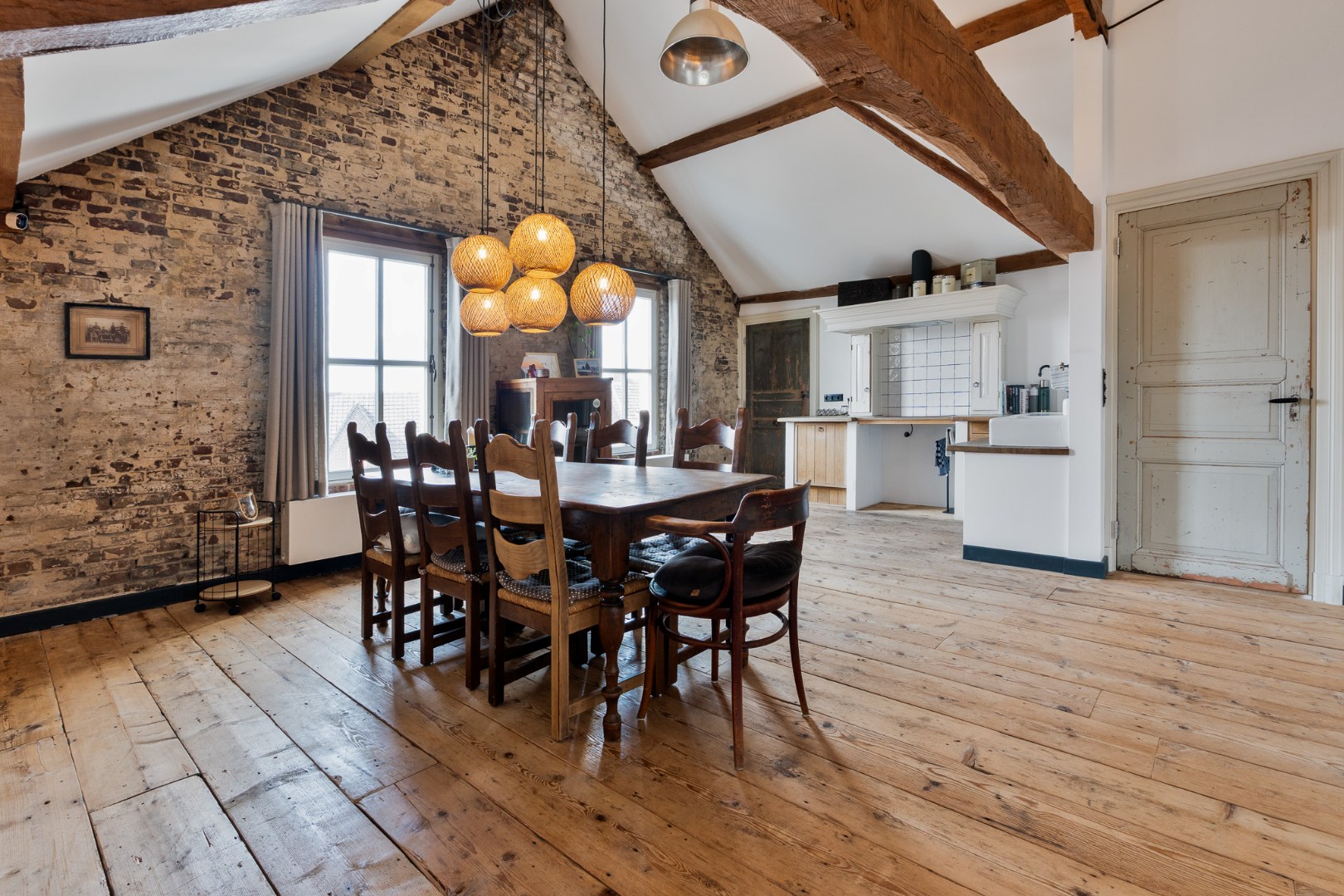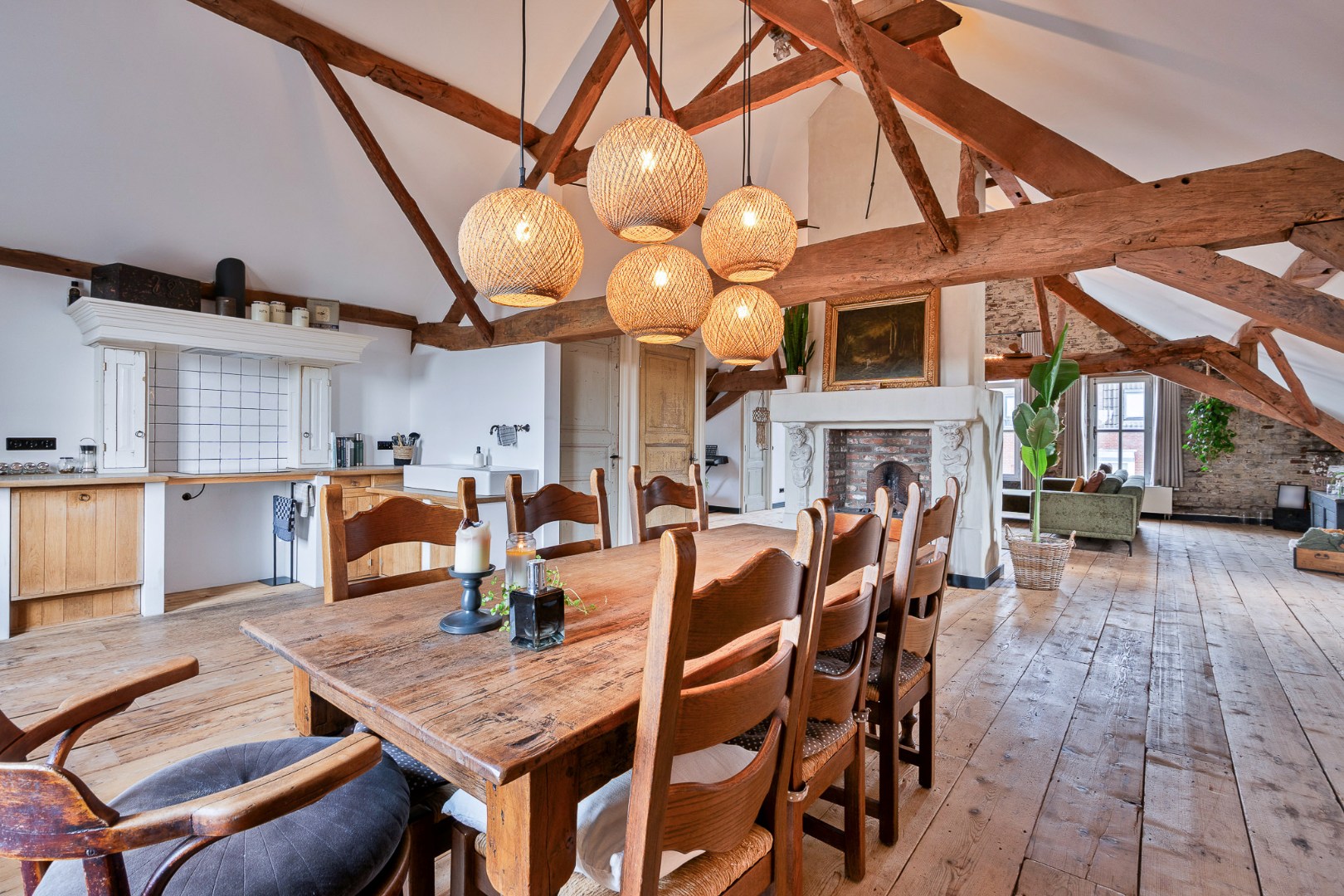 • Tweede verdieping: een indrukwekkende woonkamer van ca. 67 m² met houten balken en open haard. De aangrenzende landelijke keuken (ca. 30,5 m²) is compleet uitgerust en beschikt over een praktische bijkeuken.