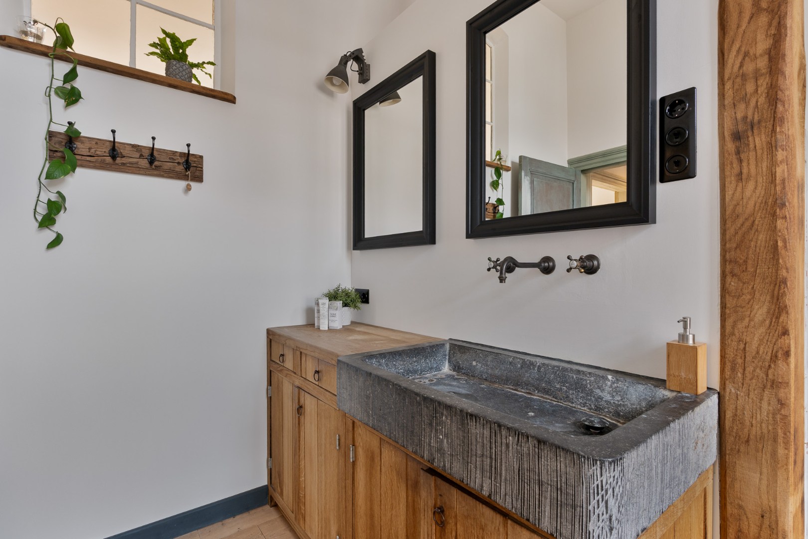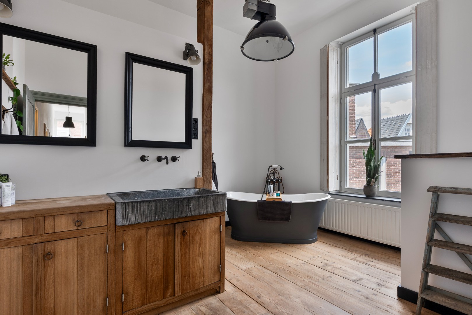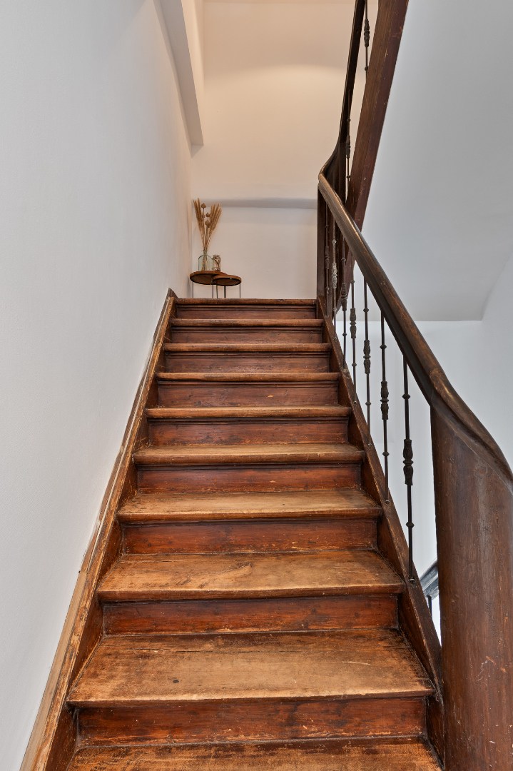 • Eerste verdieping: vijf ruime slaapkamers, hoge plafonds, houten vloeren en veel licht. Eén kamer is momenteel ingericht als inloopkast met witgoedaansluiting. De stijlvolle badkamer beschikt over een ligbad, inloopdouche, hangtoilet en wastafelmeubel met authentieke details.