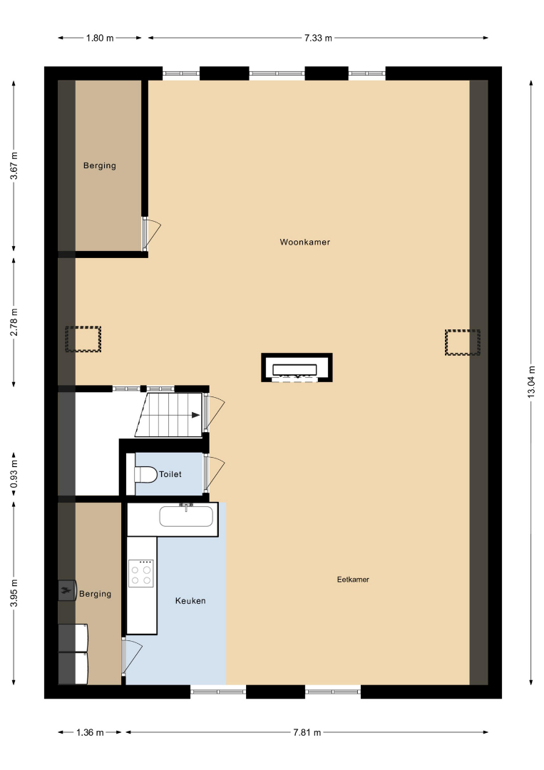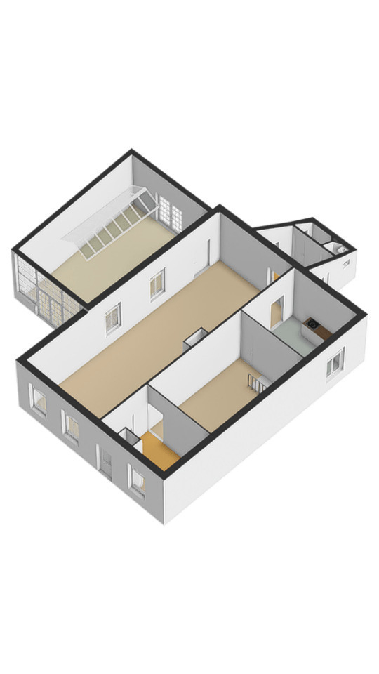 - Daarnaast is er een royaal souterrain (ca. 112m2), verdeeld over drie grote ruimtes: ideaal als opslagruimte, atelier, showroomuitbreiding of extra werkplekken voor een kantoor met flexplekken.