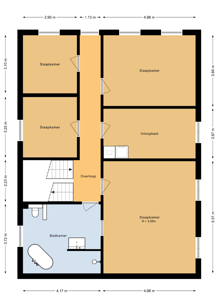 - Op de eerste verdieping vind je vijf ruime slaapkamers, waarvan één momenteel dienstdoet als inloopkast met witgoedaansluiting. De kamers (ca. 30m2, 19m2, 9m2 en 9m2) zijn licht en voorzien van hoge plafonds en houten vloeren. De badkamer (ca. 15,5m2) is stijlvol ingericht met een ligbad, inloopdouche, hangtoilet en wastafelmeubel met authentieke details.
