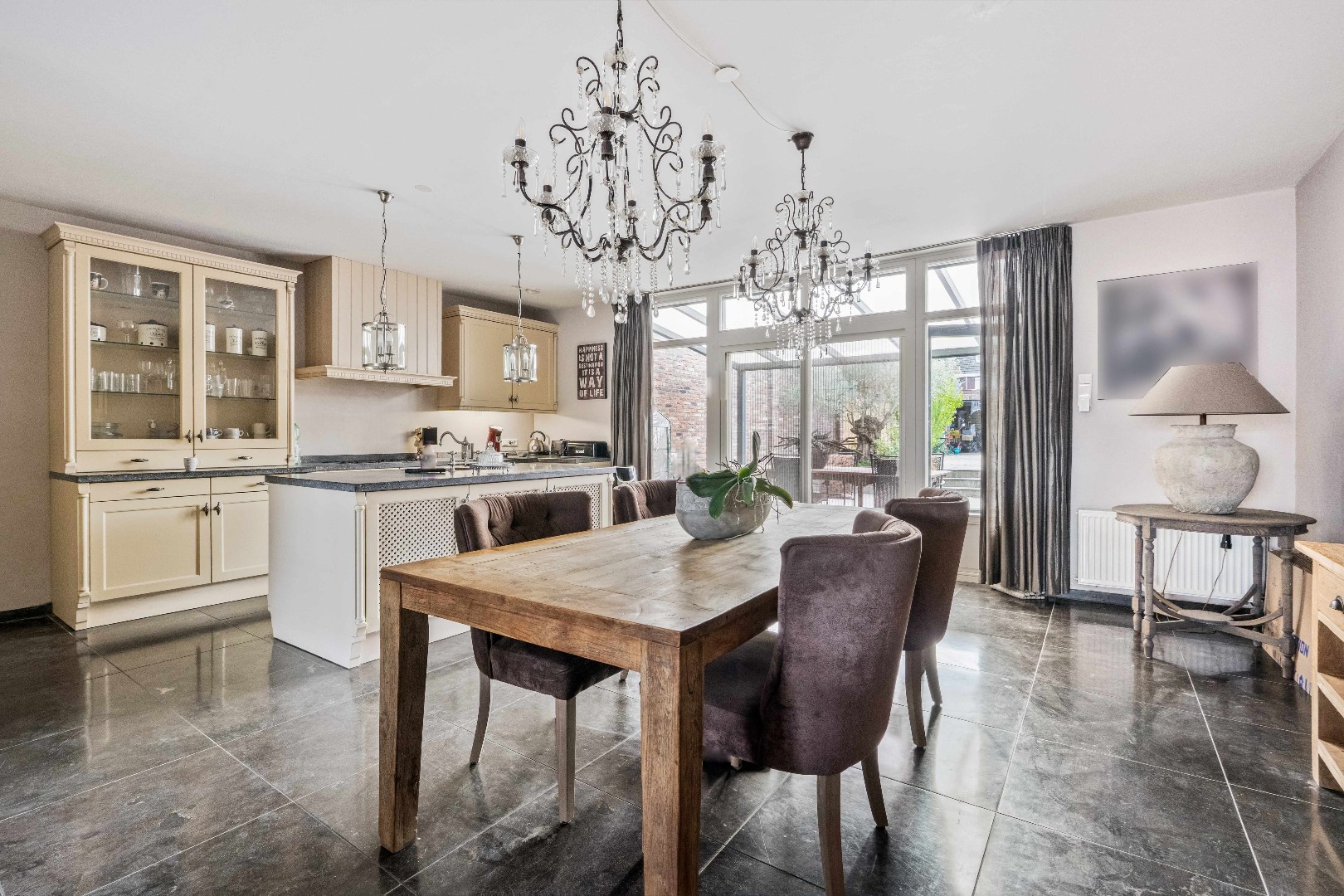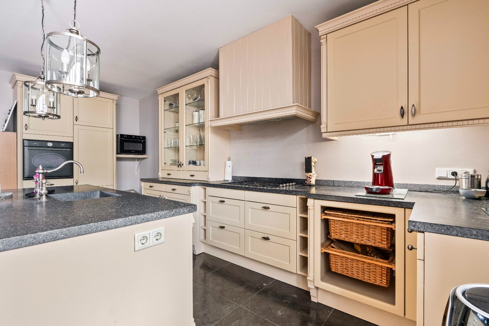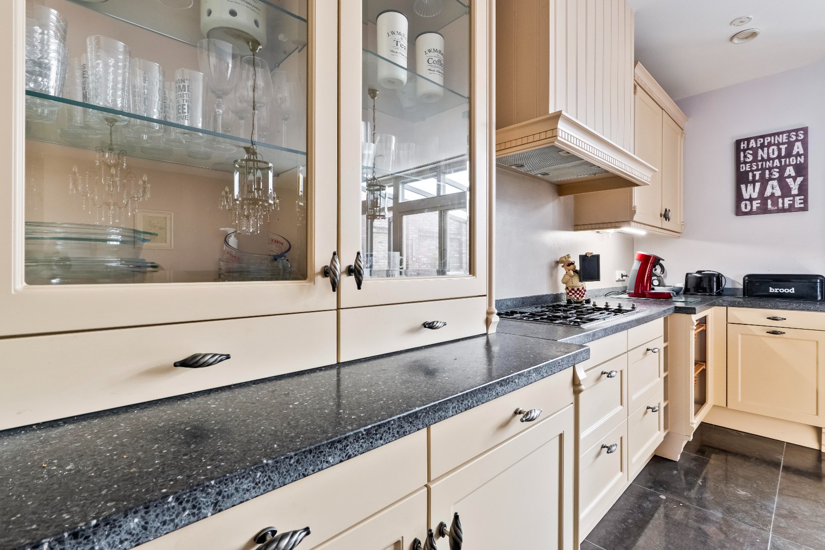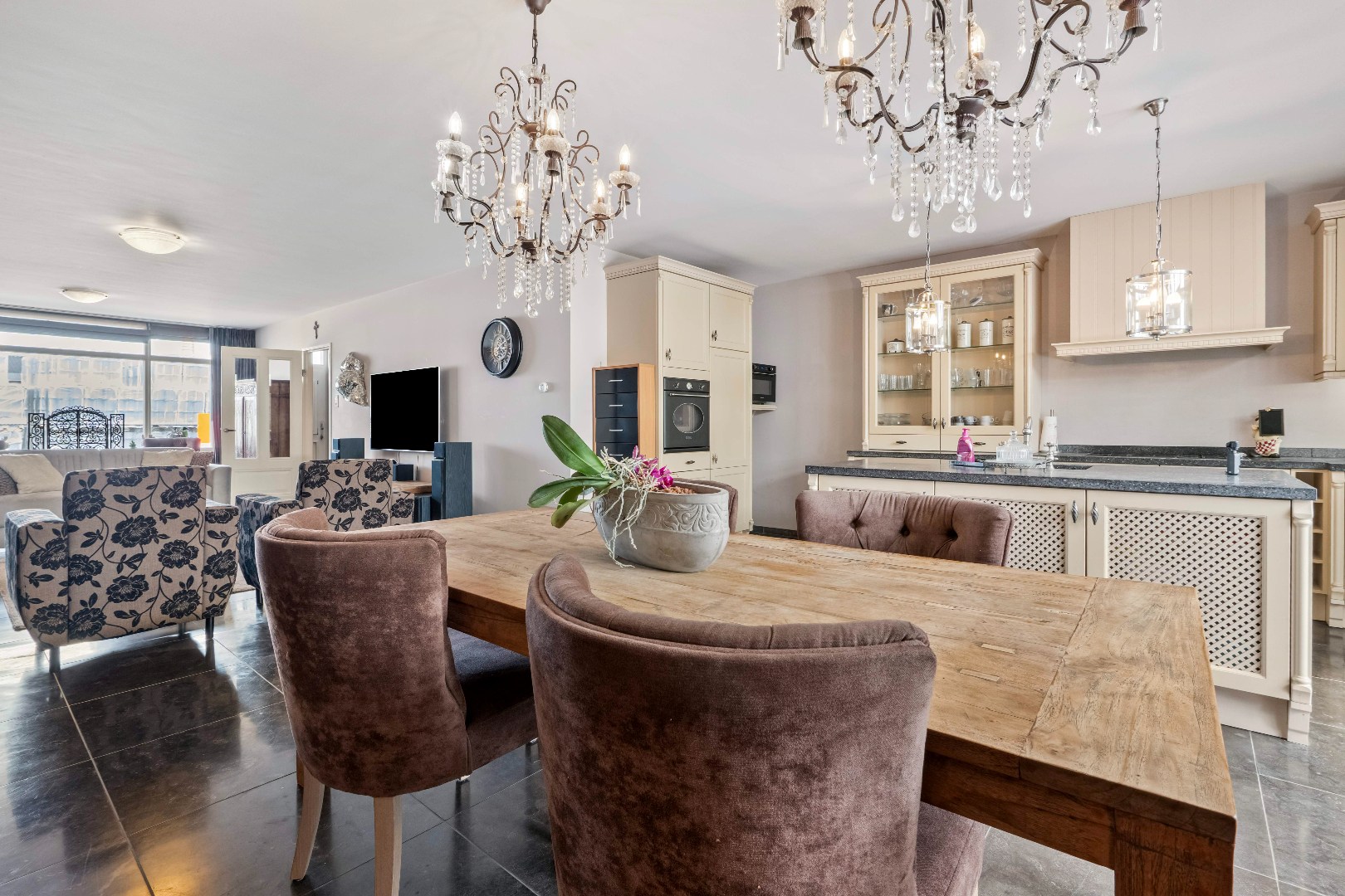De lichte en ruime woonkamer met open keuken (ca. 66,5 m²) vormt het hart van de woning. De keuken is voorzien van een 5-pits gasfornuis, oven, koelkast met vriesvakje, een royaal kookeiland met spoelbak én veel kastruimte. Vanuit de woonkamer loop je zo de diepe achtertuin in met gezellige overkapping, vrije achterom en een geïsoleerde garage (ca. 35 m²) met dubbele deuren.