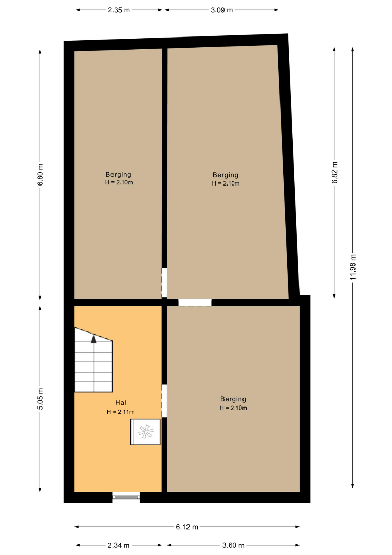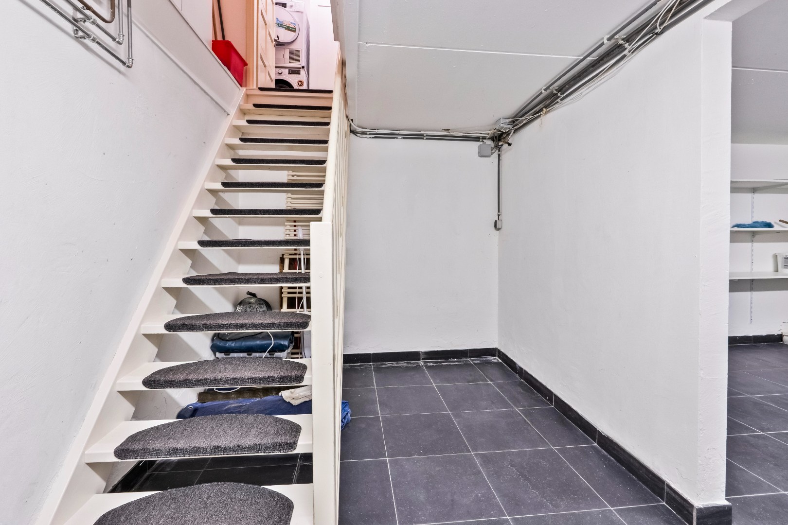 Via de hal met modern hangtoilet en fonteintje bereik je een handige bergruimte met witgoedaansluitingen en de trap naar de royale kelder (ca. 55 m²).