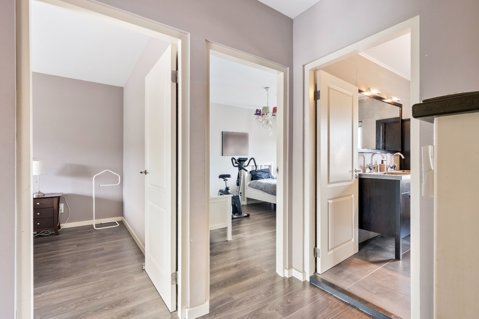 De overloop met airconditioning geeft toegang tot drie ruime slaapkamers (ca. 14 m², 15,5 m² en 11 m²), allen uitgerust met elektrische rolluiken. De luxe badkamer (ca. 10,5 m²) is modern afgewerkt en voorzien van een ligbad, dubbele wastafel, inloop-regendouche, hangend toilet en designradiator.