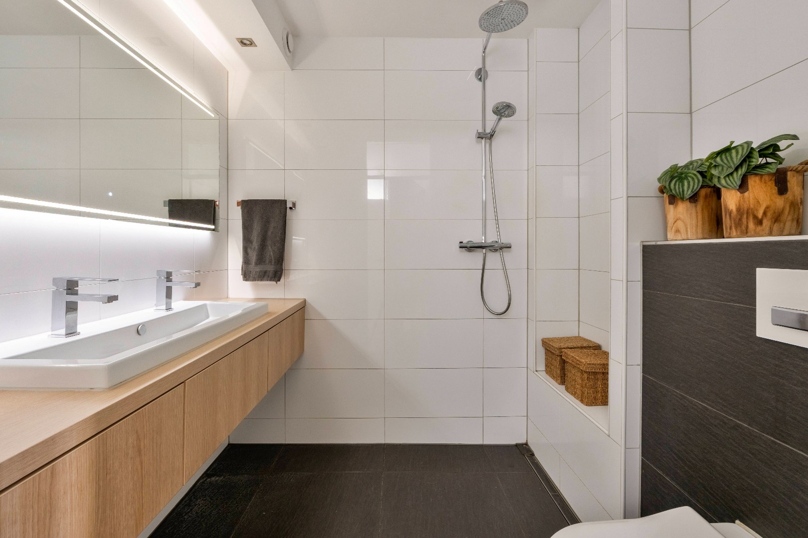 De volledig betegelde badkamer is compleet en functioneel ingericht met een ruime inloopdouche, een dubbele wastafel met meubel en een hangcloset.
