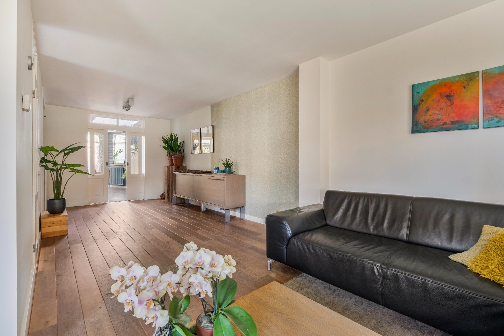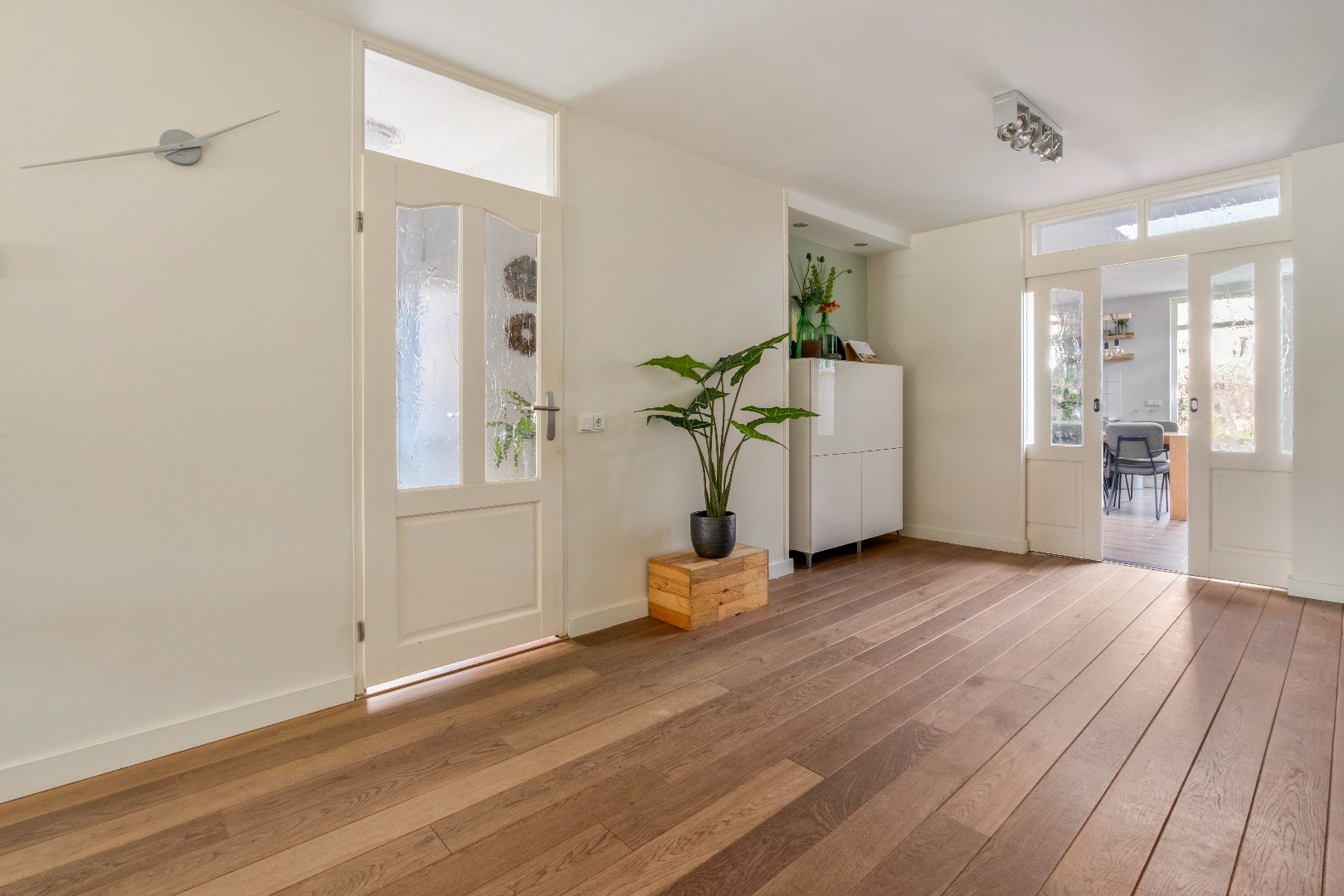 Binnenkomend in de hal is er toegang tot het toilet, de woonkamer en het trappenhuis. De woonkamer (ca. 33m2) is afgewerkt met een houten parketvloer en biedt dankzij de gaskachel een sfeervolle tv-corner. De schuifdeuren tussen de woonkamer en de keuken zorgen voor een mooie verbinding tussen beide ruimtes, terwijl ze tegelijkertijd de mogelijkheid bieden om de vertrekken van elkaar te scheiden.