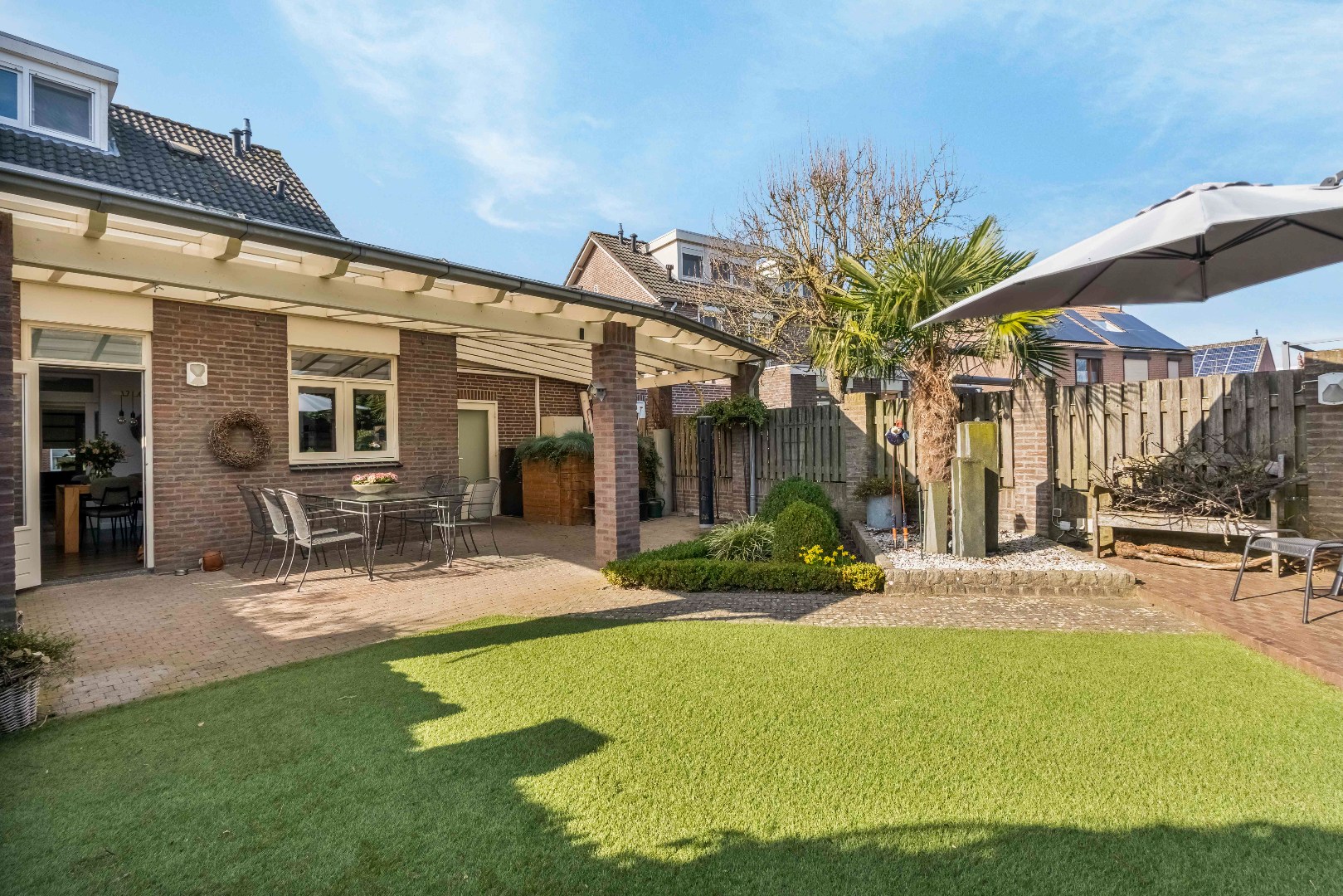 De achtertuin van deze woning is een perfecte mix van comfort, weinig onderhoud en maximaal gemak. Het kunstgras zorgt voor een onderhoudsvriendelijke en groene uitstraling, zodat je meer tijd overhoudt om van het buitenleven te genieten. De royale houten overkapping (ca. 33m2) biedt een fijne plek om lange zomeravonden ontspannen buiten door te brengen, ongeacht het weer.