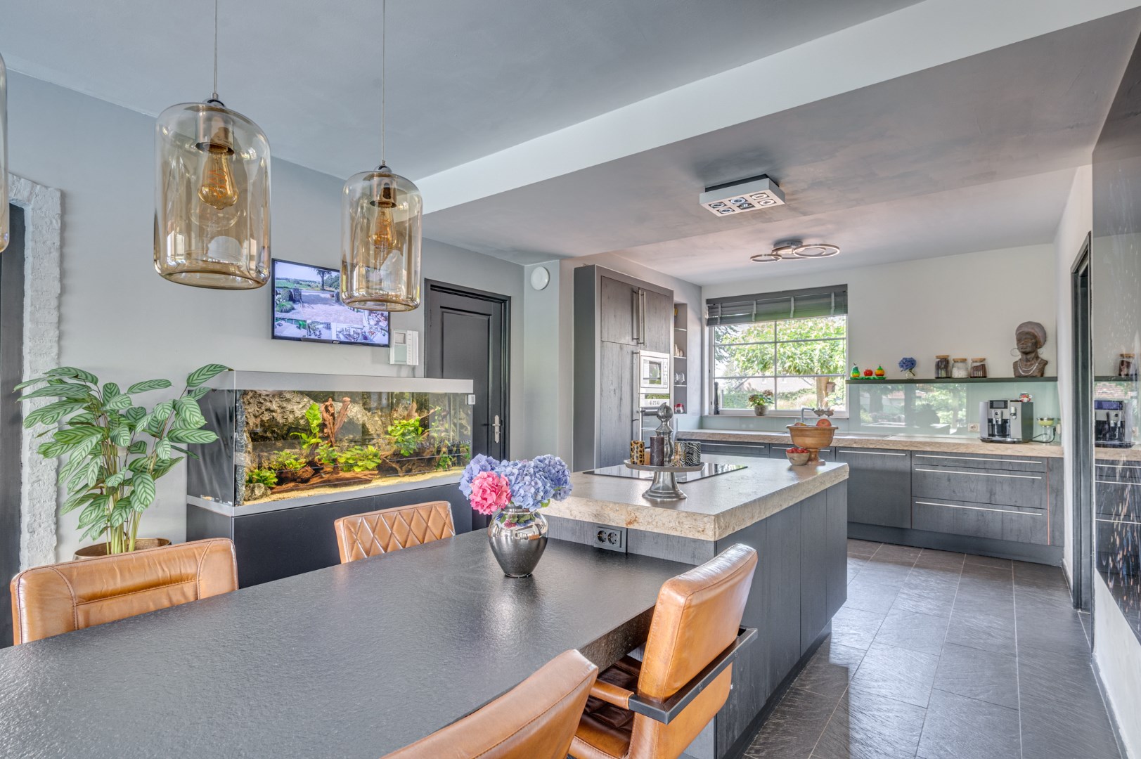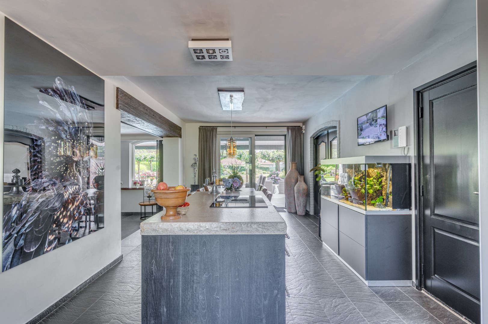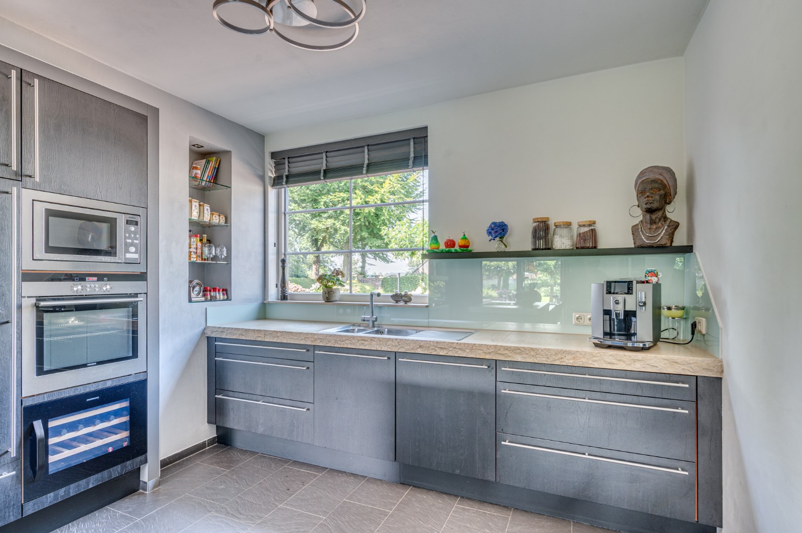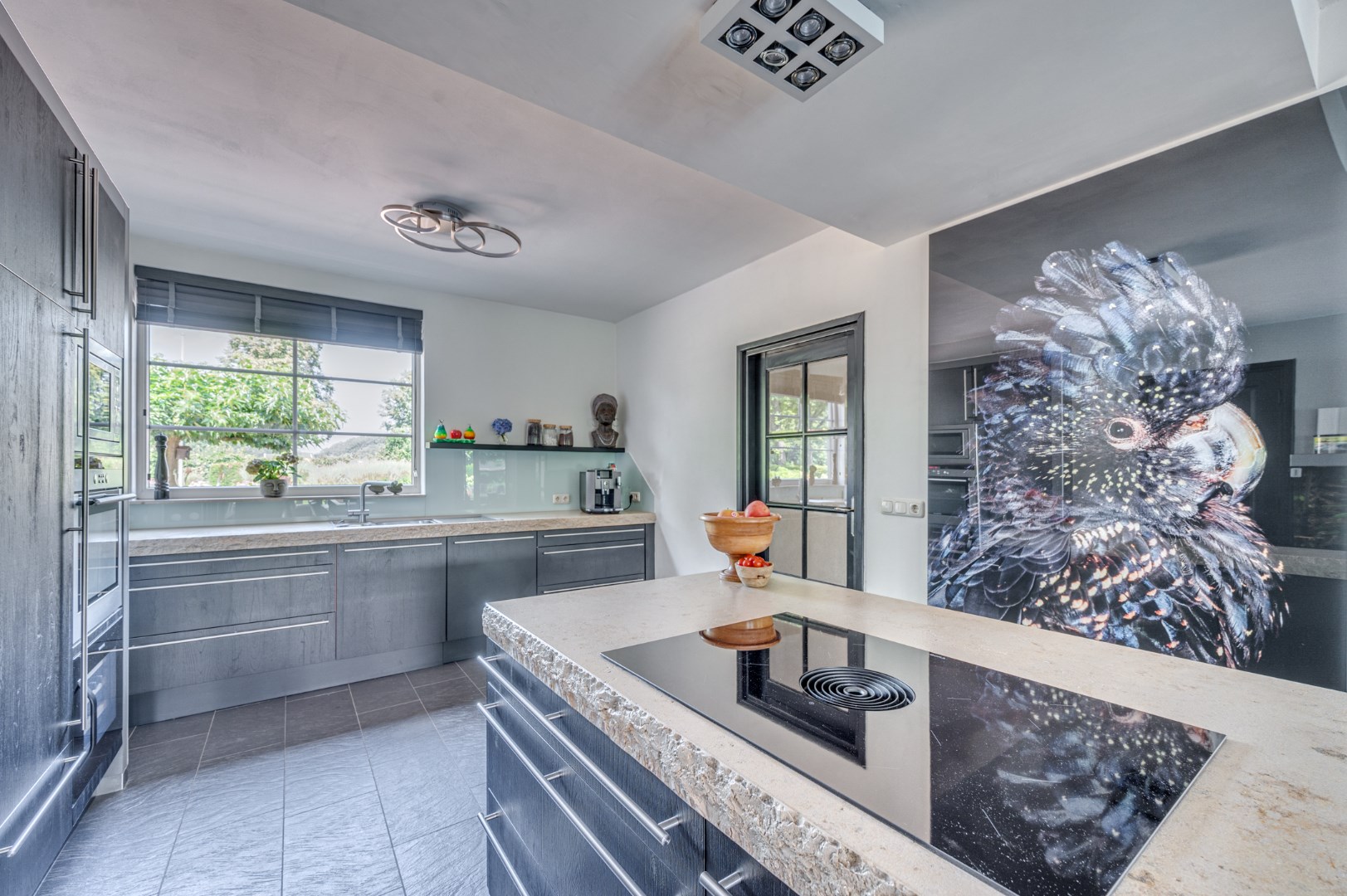 De moderne keuken is voorzien van een schuifpui die direct toegang biedt tot een royaal