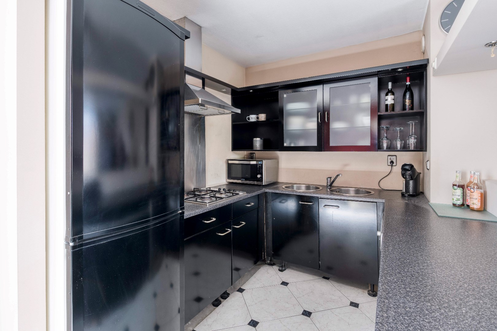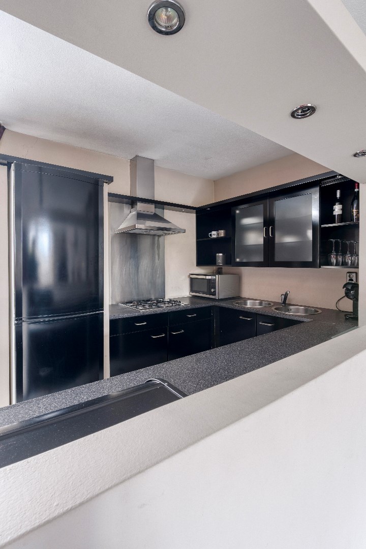 De open keuken (ca. 6m2) is voorzien van een bar, inbouwspotjes en een complete, doch eenvoudige keukenopstelling.