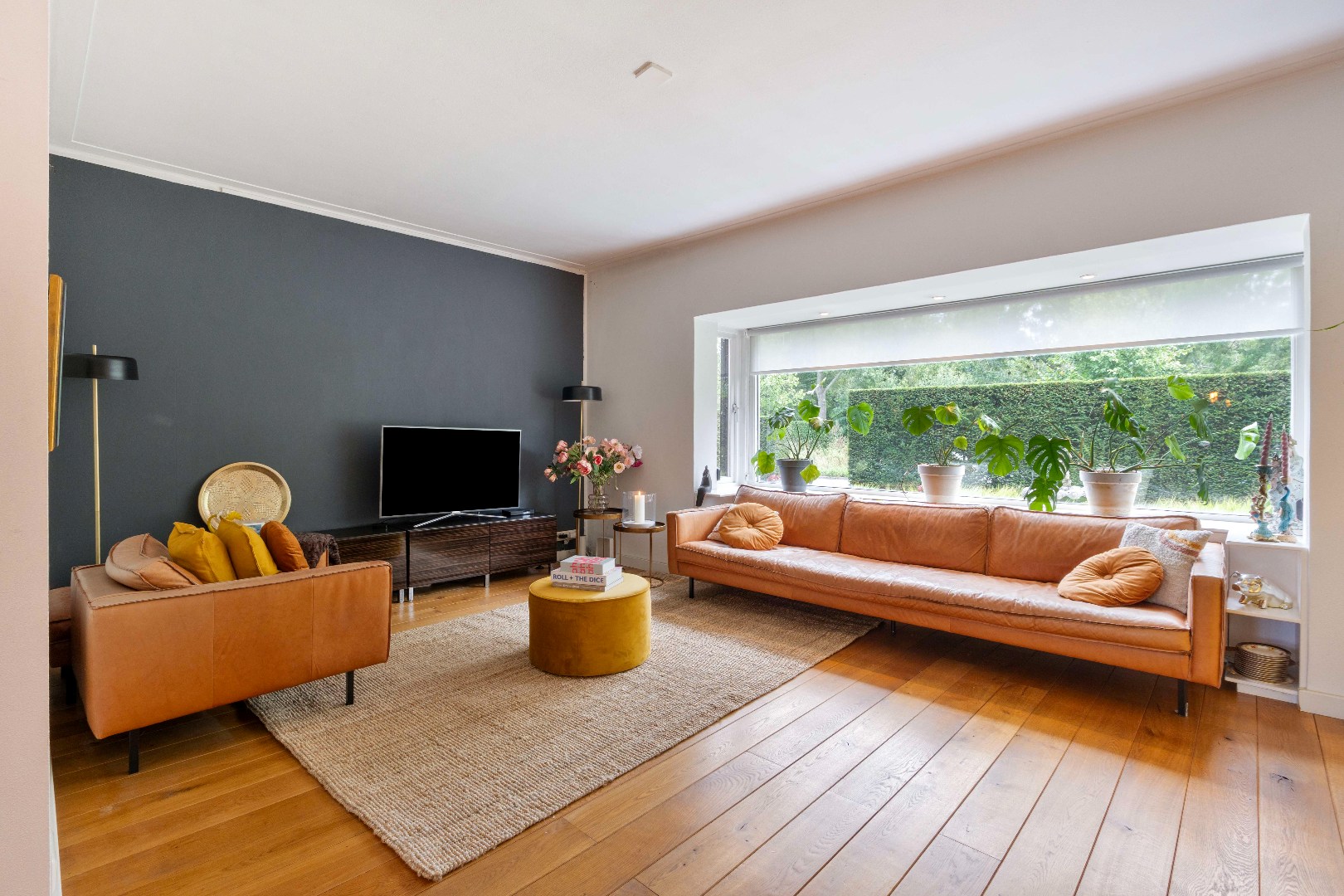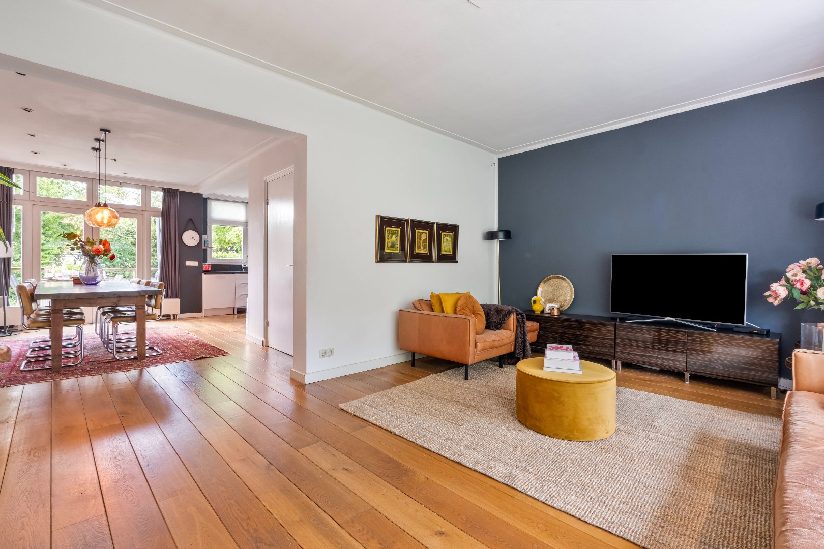- De royale woonkamer (ca. 22,5m2) is een echte eyecatcher: een karakteristieke erker, een warme houten vloer, een sfeervolle gashaard en openslaande deuren naar het terras laten het zonlicht binnenstromen en bieden uitzicht op het groen.