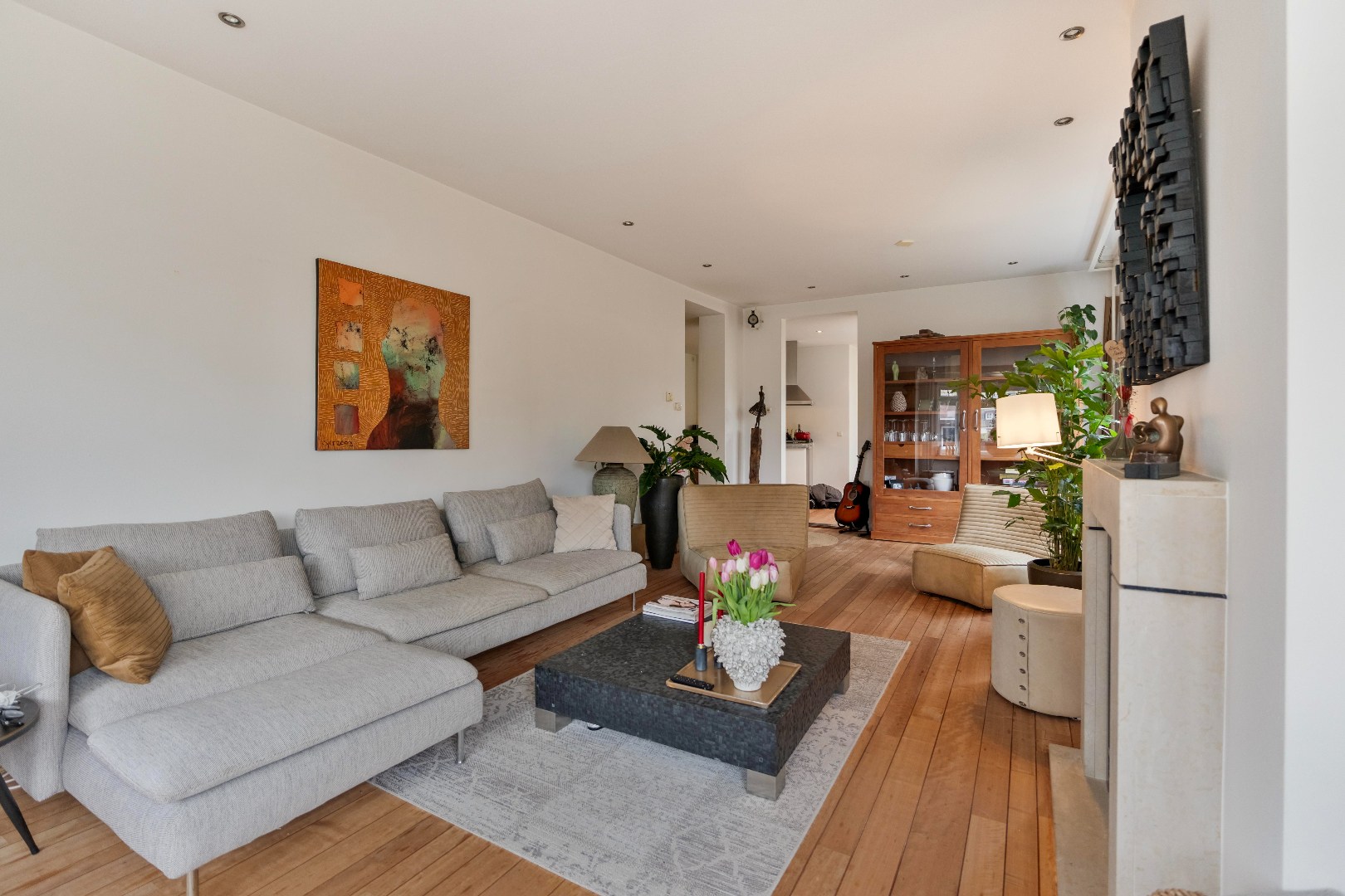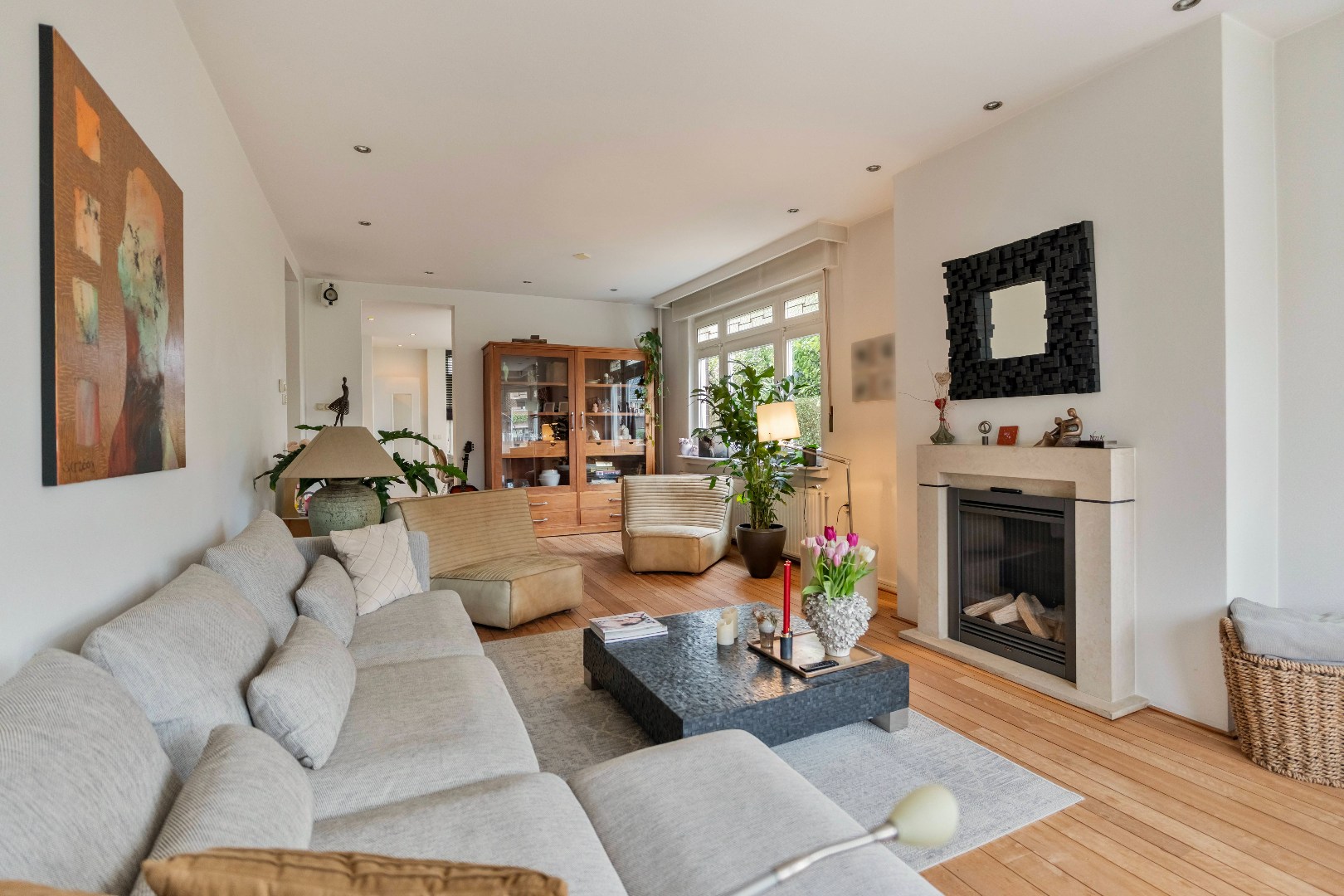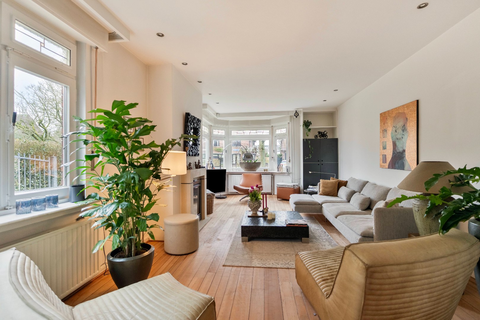 De ontvangst is royaal en stijlvol. Het heeft details die direct de sfeer van de woning benadrukken. In de woonkamer (ca. 35m2) komt het karakter volledig tot leven met het glas-in-lood, de erker aan de voorzijde en de warme kersenhouten parketvloer. De gashaard zorgt voor extra gezelligheid, terwijl moderne inbouwspotjes op subtiele wijze voor sfeervol licht zorgen. Een bijzonder detail is dat de originele rolluiken uit 1938 behouden zijn gebleven.