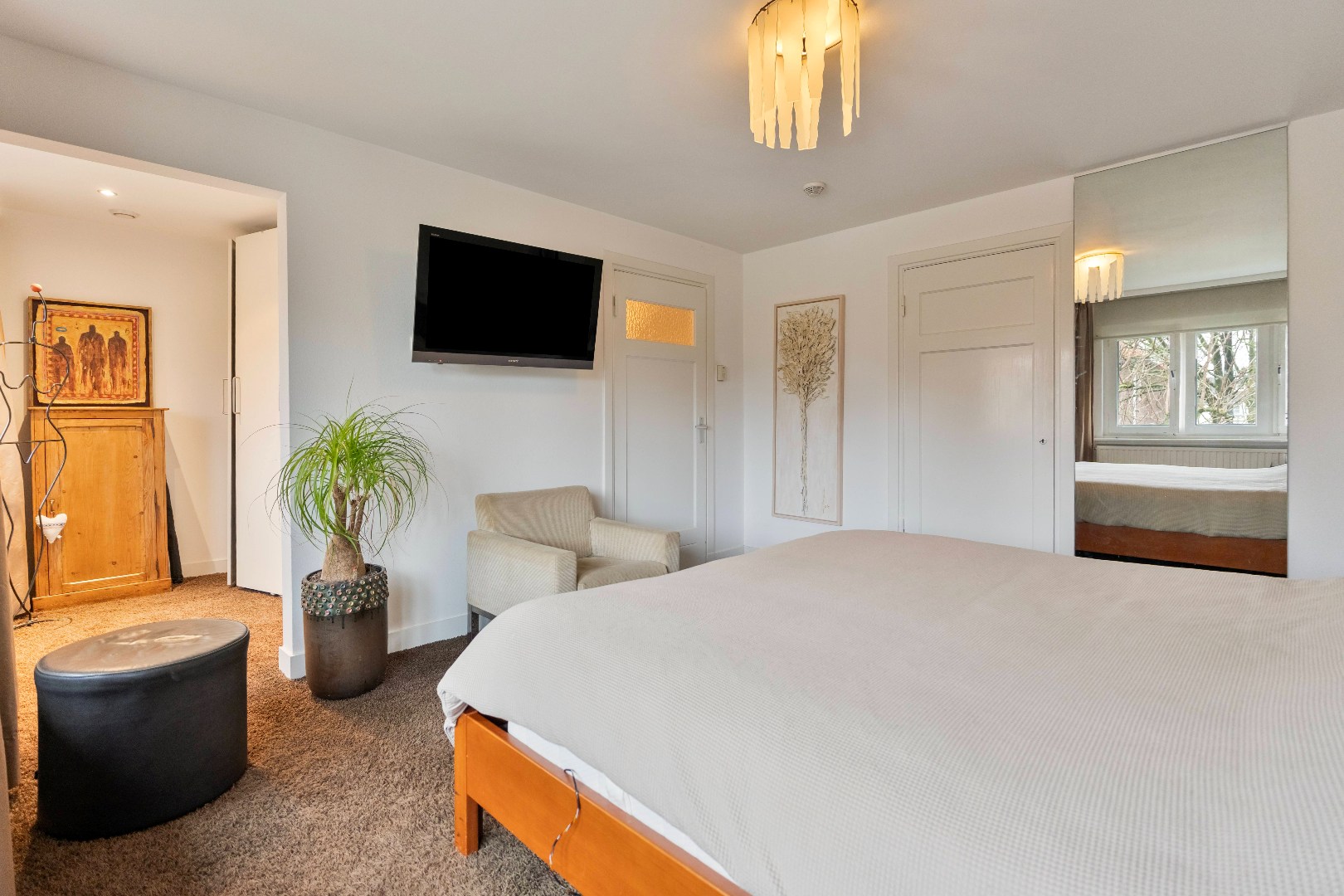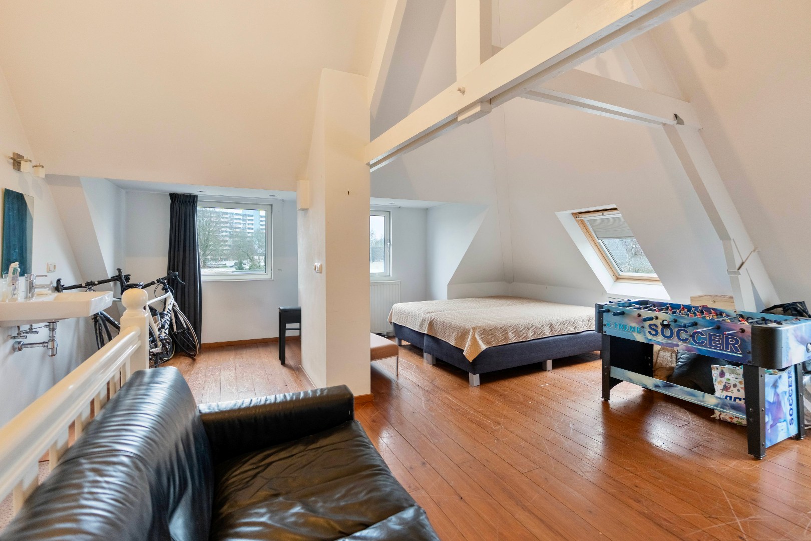 De tweede verdieping biedt een riante extra kamer (ca 23m2) met vurenhouten vloer en veel daglicht dankzij de vele raampartijen. Deze veelzijdige ruimte is uitermate geschikt als extra slaapkamer, thuiswerkplek, atelier of gym en beschikt over een wastafel en extra bergruimte.