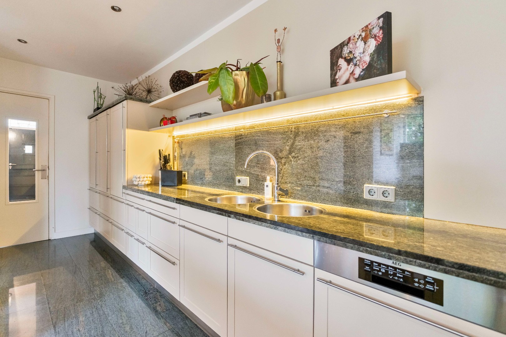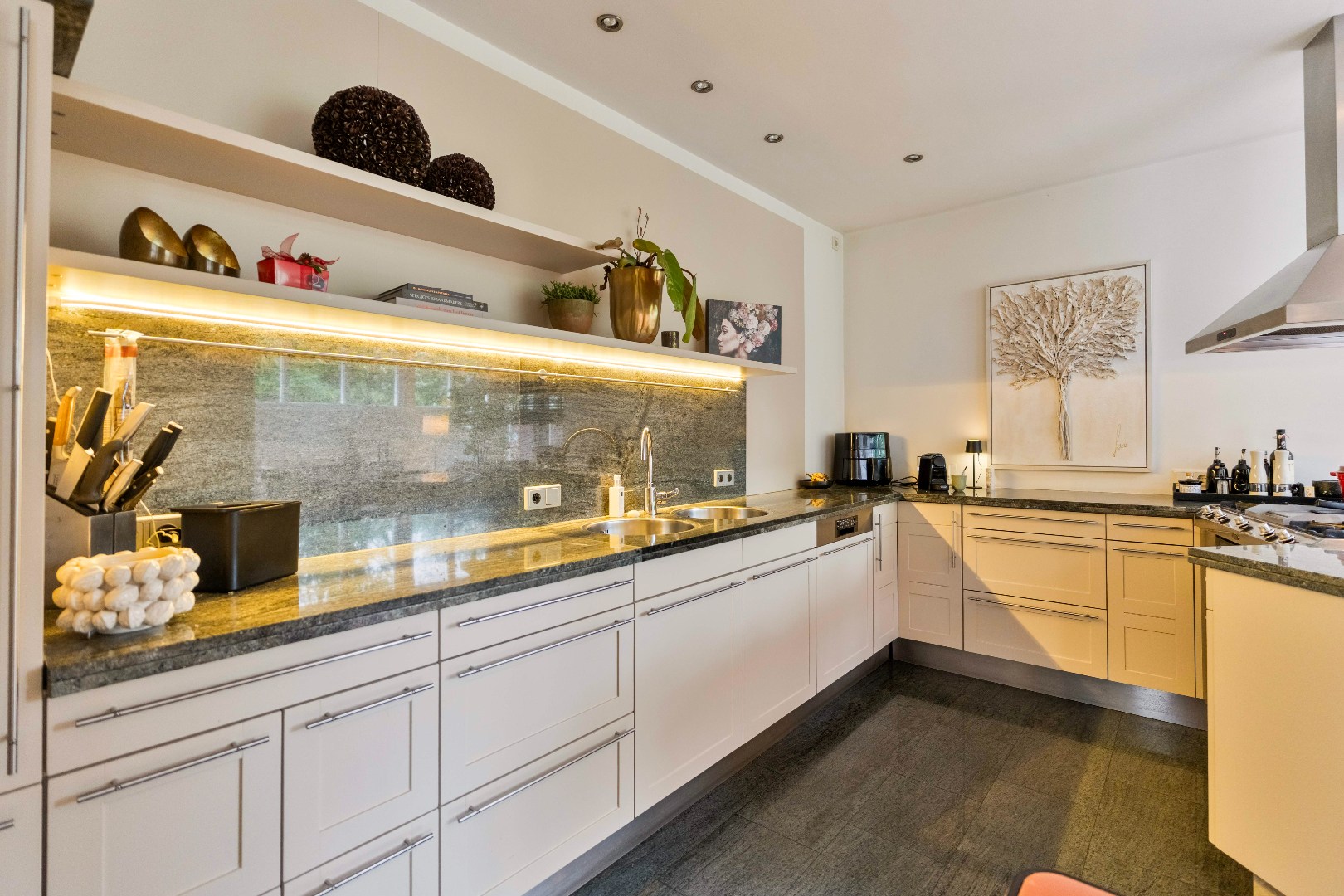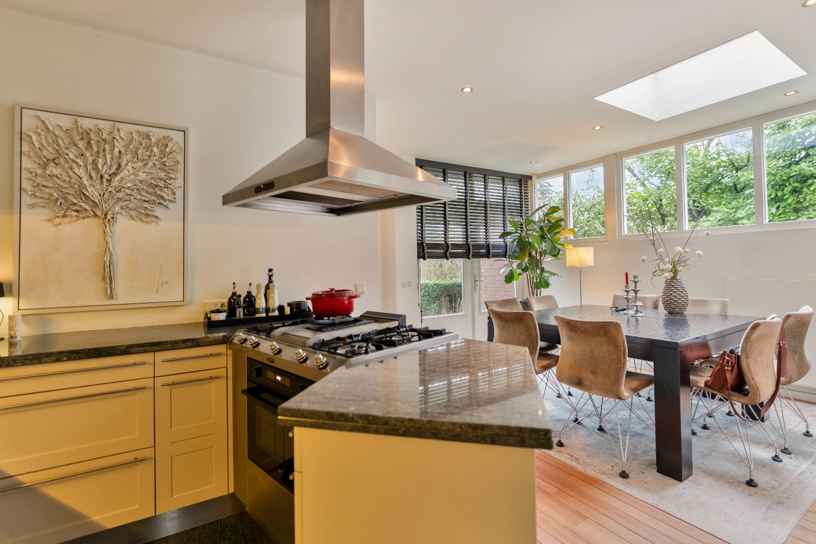 Aan de achterzijde bevindt zich een woonkeuken met eetgedeelte (ca. 27,5m2) . Dankzij de lichtkoepel en de raampartijen is dit een heerlijke plek om samen te komen. Via de openslaande terrasdeuren staat deze ruimte in direct contact met de tuin. De keuken is uitgerust met diverse inbouwapparatuur, waaronder een 4-pits gasfornuis met tepanyakiplaat, vaatwasser, koelkast, oven en afzuigkap. Het granieten aanrechtblad en de natuurstenen vloer in zowel de keuken als de hal zorgen voor een luxe en tijdloze uitstraling. Aangrenzend vindt u de praktische bijkeuken (ca. 7,5m2) met witgoedaansluitingen en de CV-ketel (eigendom en minimaal 15 jaar oud), eveneens met toegang tot de tuin.