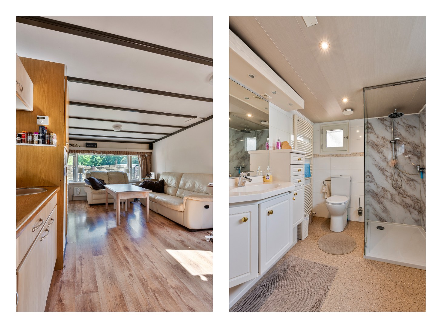 - De gezellige zithoek met elektrische kachel en aan de achterzijde de schuifpui zorgen voor extra sfeer en lichtinval.
