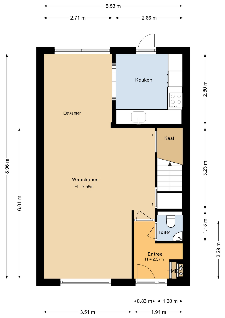 Entree, hal, moderne compleet betegelde toiletruimte met hangend closet en fontein, ruime T- vormige woonkamer (ca. 32m2) met praktische bergkast, halfopen keuken (ca. 7,5m2) met keukenblok voorzien van inbouwverlichting en diverse inbouwapparatuur (vaatwasser, oven, koelkast, inductie kookplaat, magnetron en afzuigkap). De begane grond is compleet voorzien van een tegelvloer met vloerverwarming (bijverwarming).
