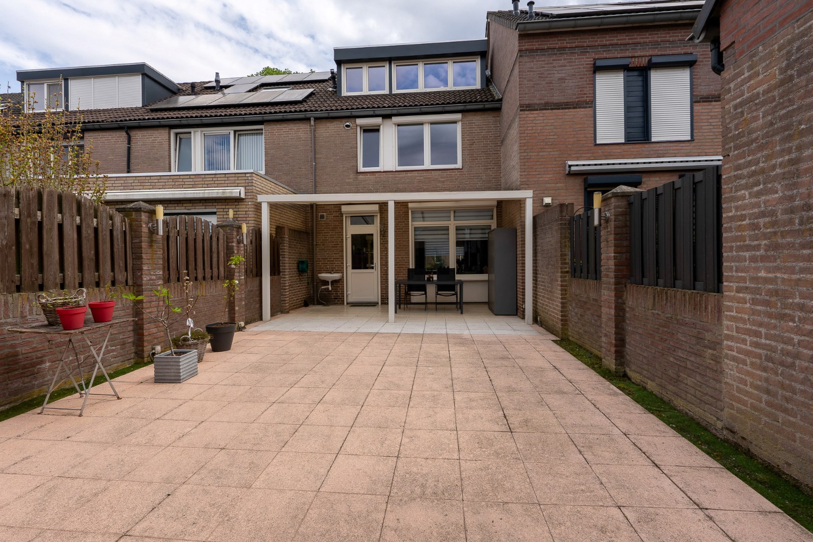 De achtertuin met overkapping, tuinhuis en bbq is compleet betegeld en heeft een vrije achterom.
