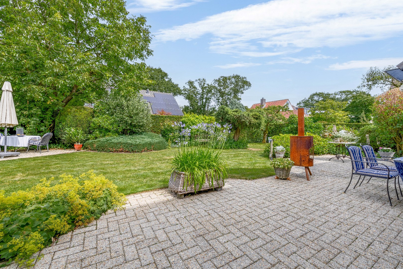 Vanuit de woonkamer loopt u via een schuifpui naar het royale- en deels overdekte terras en